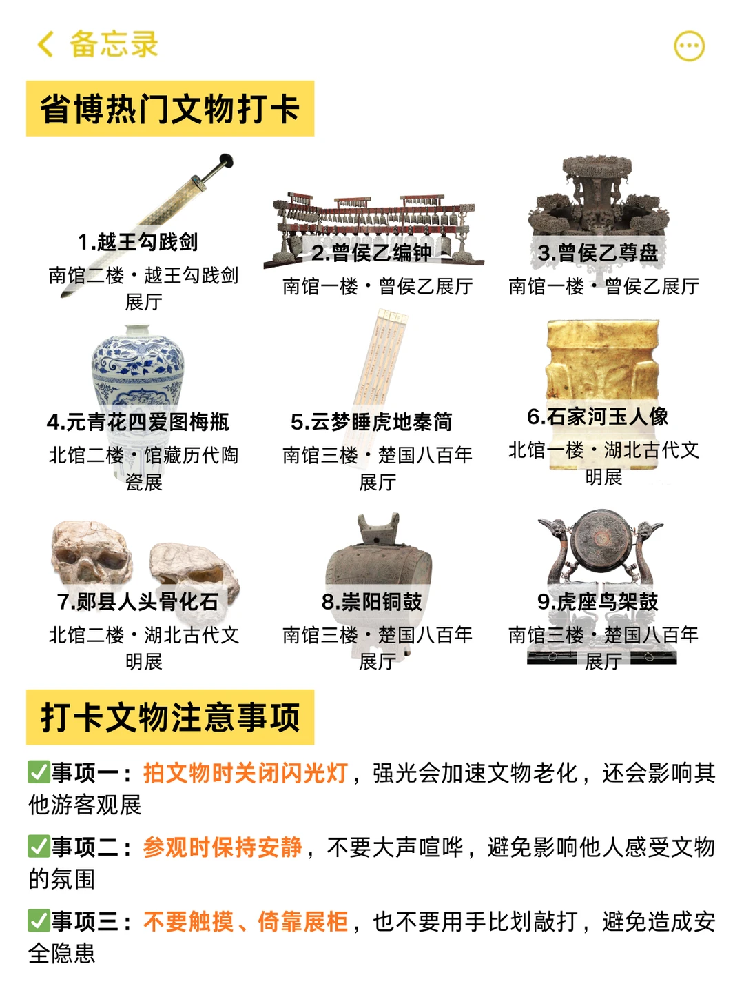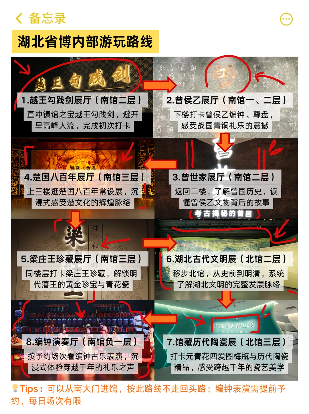 1. 南馆二楼越王勾践剑展厅 → 2. 南馆一楼曾侯乙展厅 → 3. 南馆二楼曾世家展厅 → 4. 南馆三楼楚国八百年展厅 → 5. 南馆三楼梁庄王珍藏展厅 → 6. 北馆一楼湖北古代文明展 → 7. 北馆二楼馆藏历代陶瓷展 → 8. 南馆负一楼编钟演奏厅(可选)