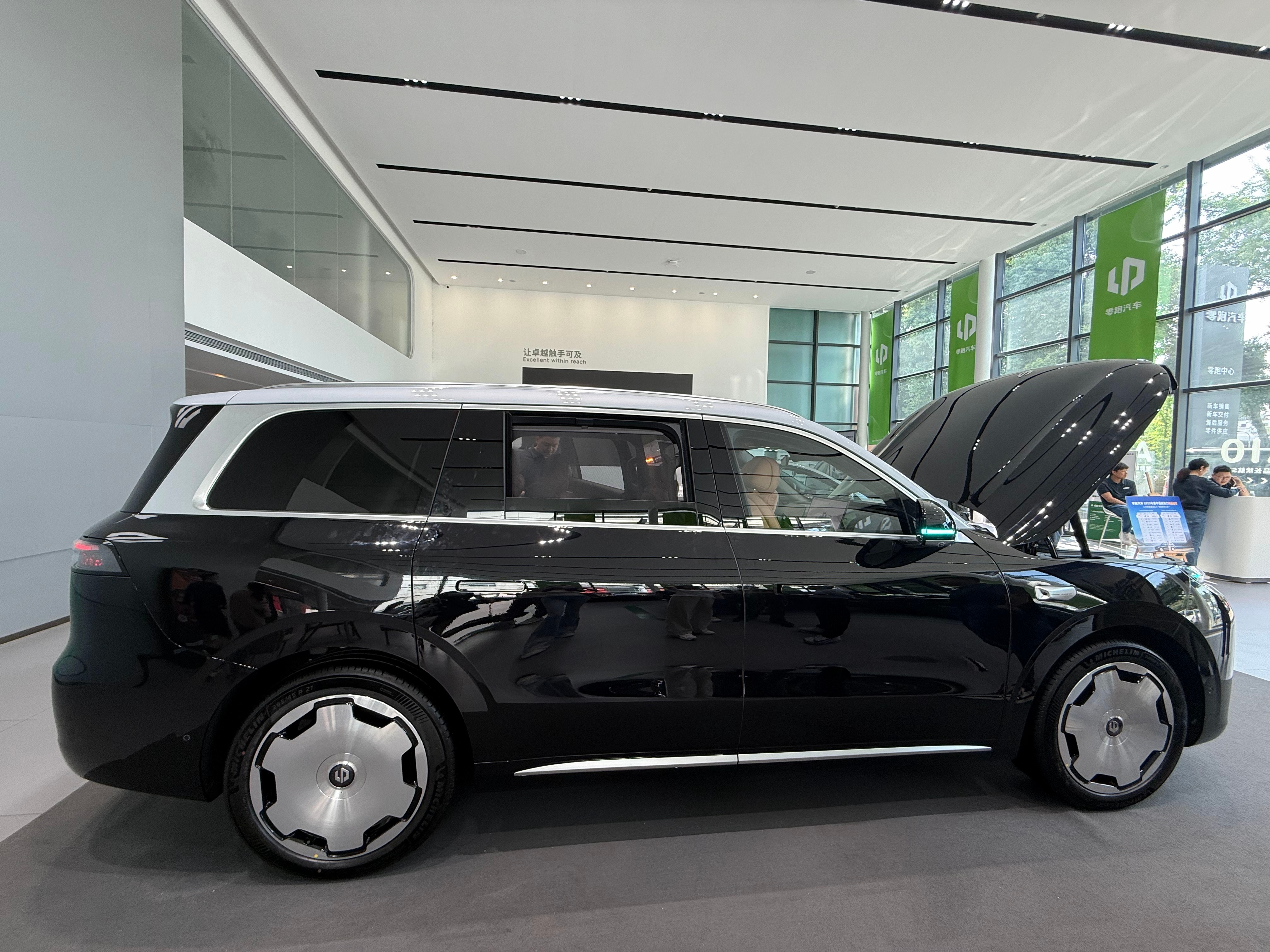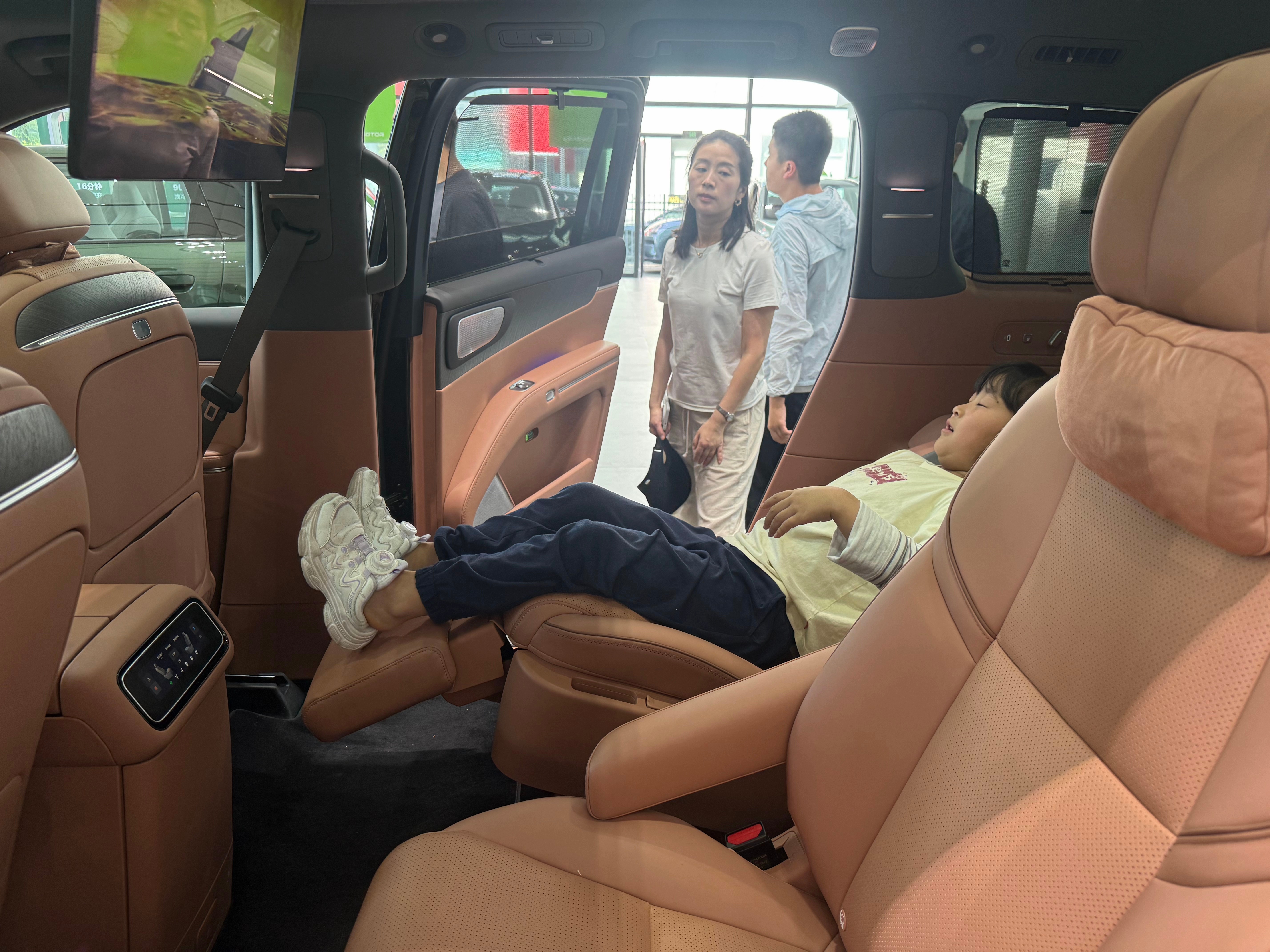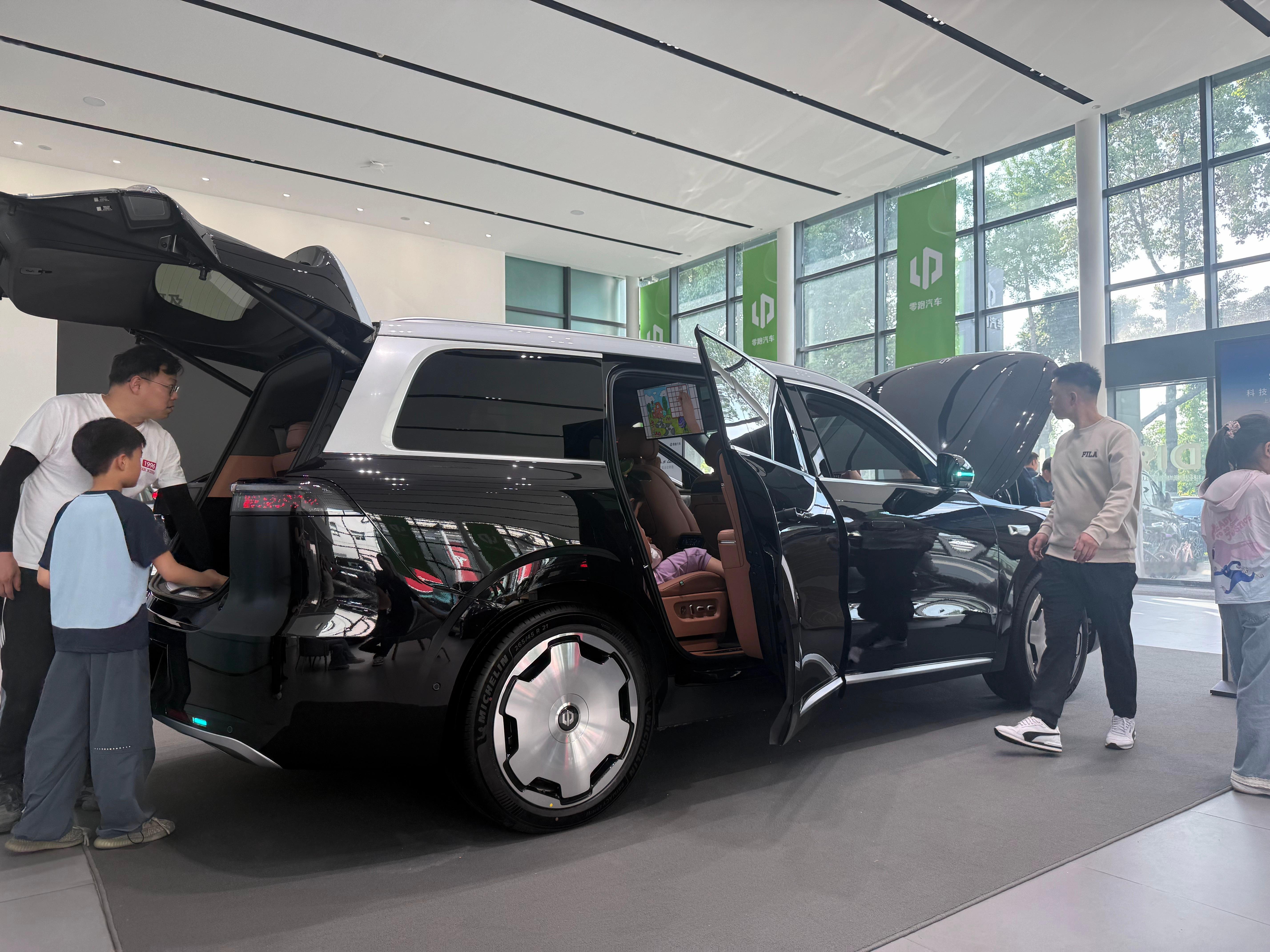 店内展车是一台外观金属黑,内饰丹雅棕的纯电六座智尊版,选装了双拼色车身、大饼轮毂、DLP大灯和制氧系统。来看车的用户几乎全是拖家带口,小孩、老人都有。看车过程中,大家最关注的就是空间和舒适配置,尤其是前备箱——甚至有用户直接拿来自家的儿童自行车,现场测试能否放下。其次就是零重力座椅和后排吸顶屏,几乎一直有人在体验。销售表示,这些用户多为换购或增购,而且很多都是零跑的老车主。
