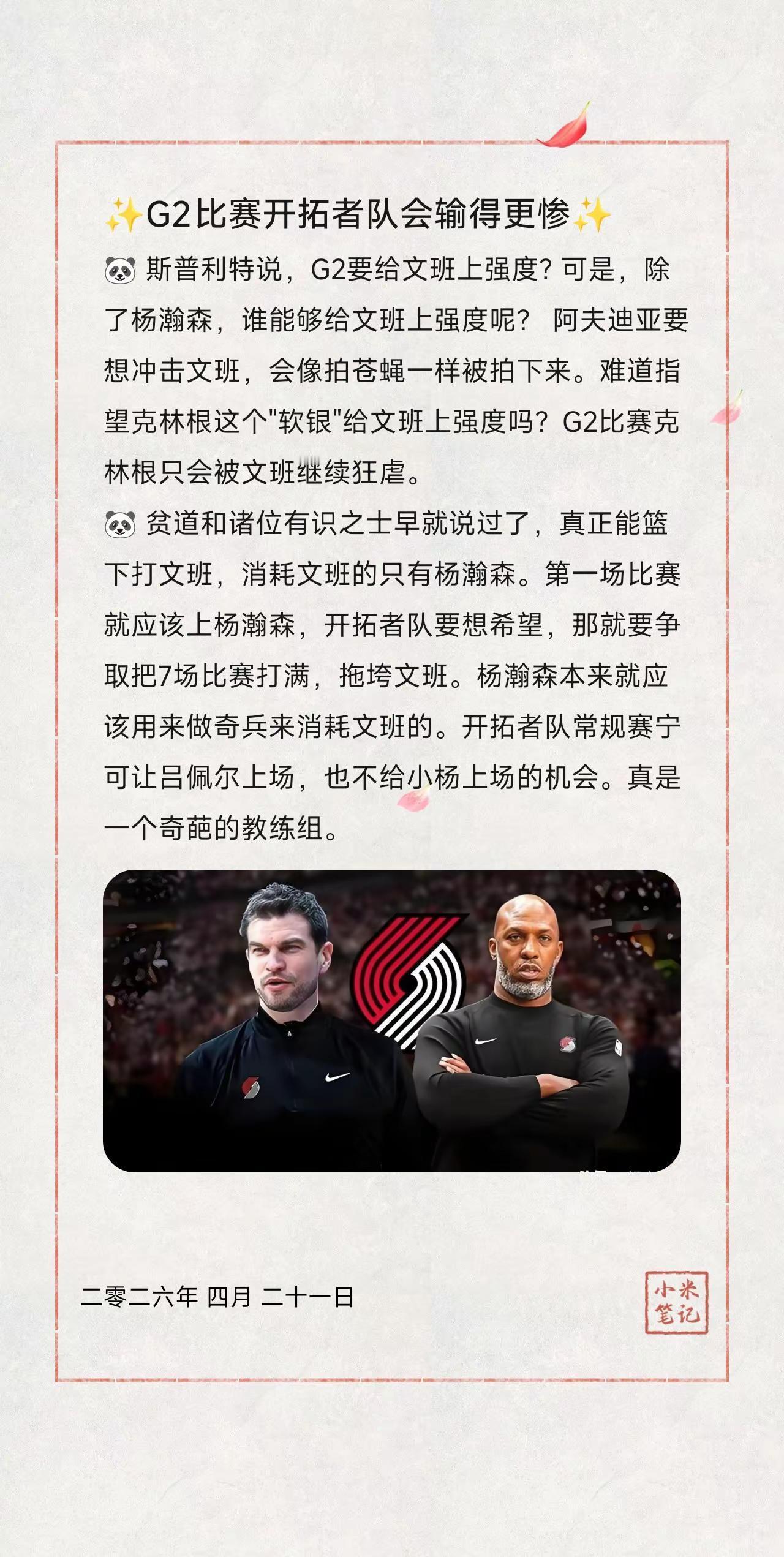 ✨G2比赛开拓者队会输得更惨✨。🐼 斯普利特说,G2要给文班上强度? 可是,除了杨瀚森,谁能够给文班上强度呢? 阿夫迪亚要想冲击文班,会像拍苍蝇一样被拍下来。难道指望克林根这个"软银"给文班上强度吗?G2比赛克林根只会被文班继续狂虐。🐼 贫道和诸位有识之士早就说过了,真正能篮下打文班,消耗文班的只有杨瀚森。第一场比赛就应该上杨瀚森,开拓者队要想希望,那就要争取把7场比赛打满,拖垮文班。🐼 杨瀚森本来就应该用来做奇兵来消耗文班的。开拓者队常规赛宁可让吕佩尔上场,也不给小杨上场的机会。真是一个奇葩的教练组。培养吕佩尔的目的是什么? 为了让他在灰熊队爆发吗? 作者:龙须面🧐