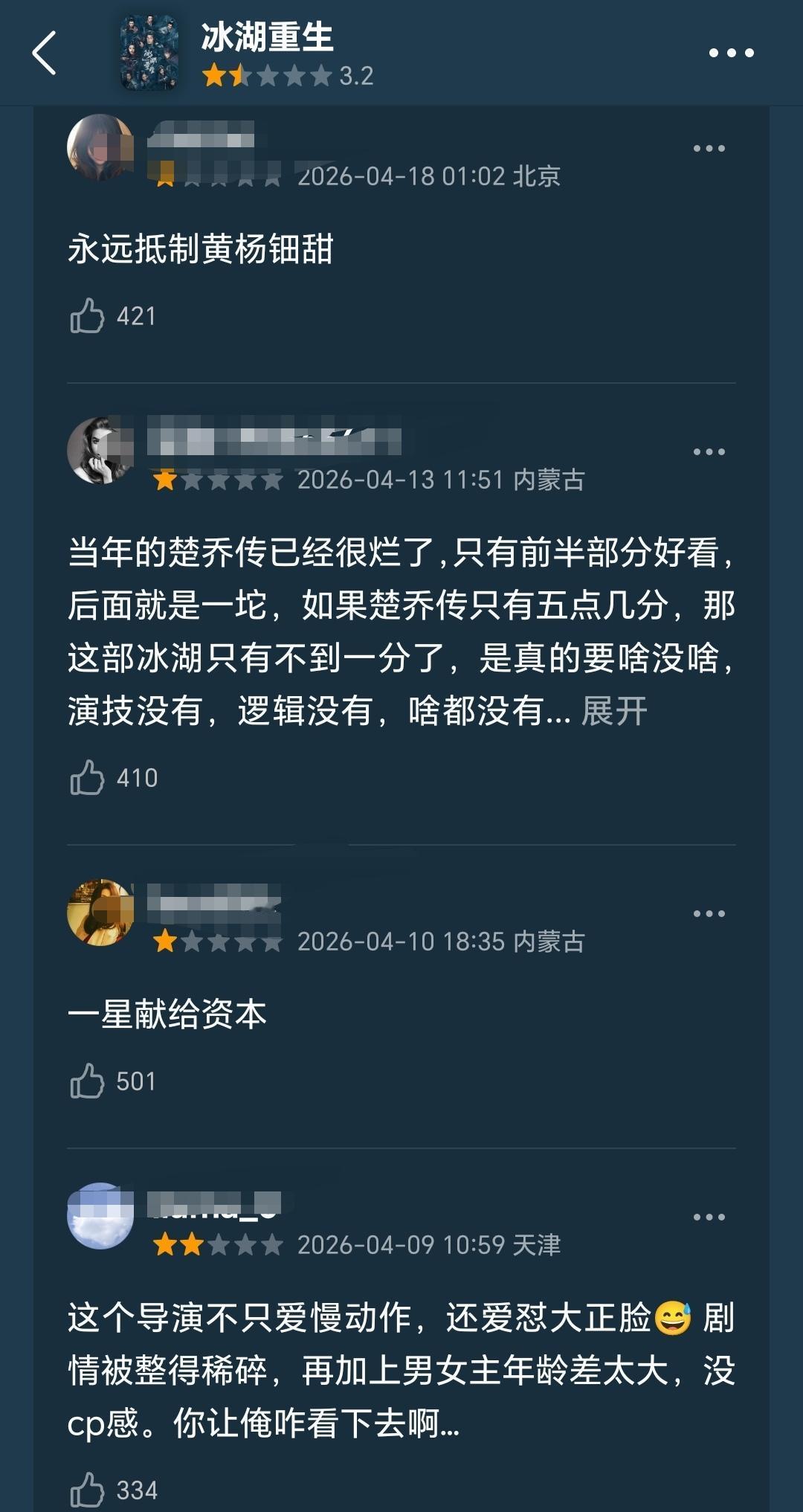 侣皓吉吉导演,魏祎编剧,李昀锐、黄杨钿甜、张康乐和夏梦等主演的《冰湖重生》在豆瓣开出3.2分的低分(17908人评分),一星差评挤满屏幕。