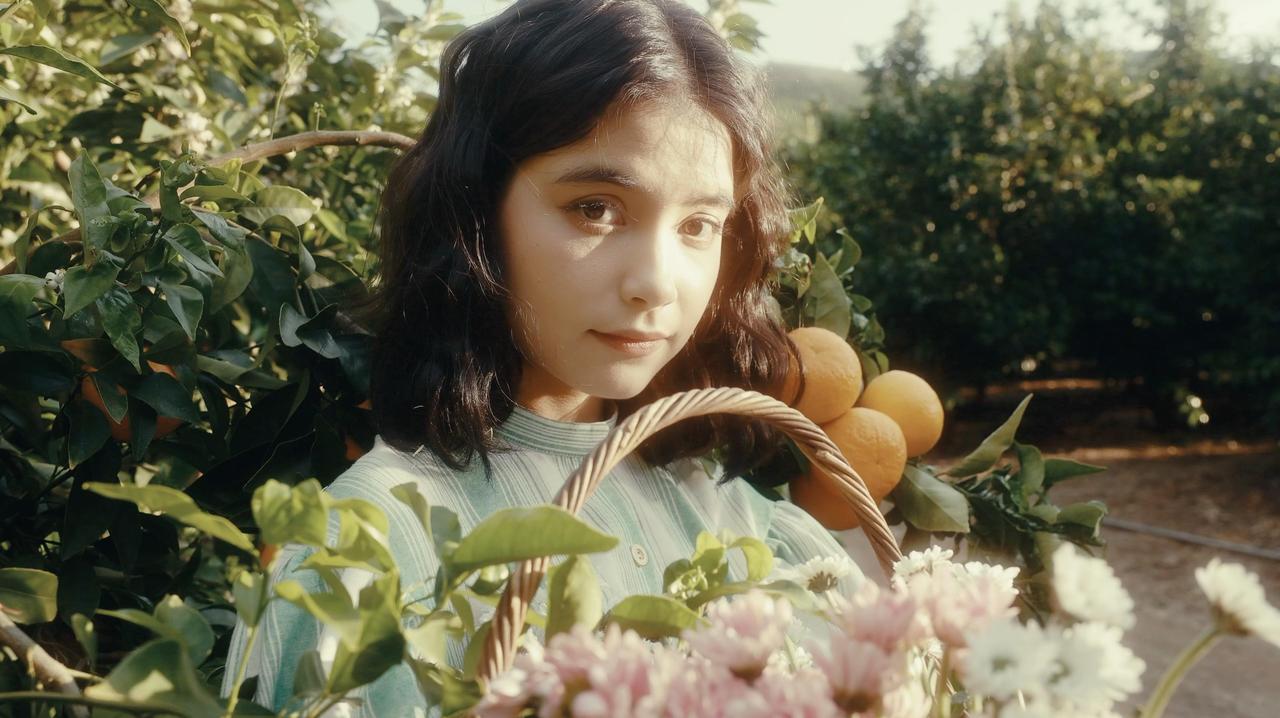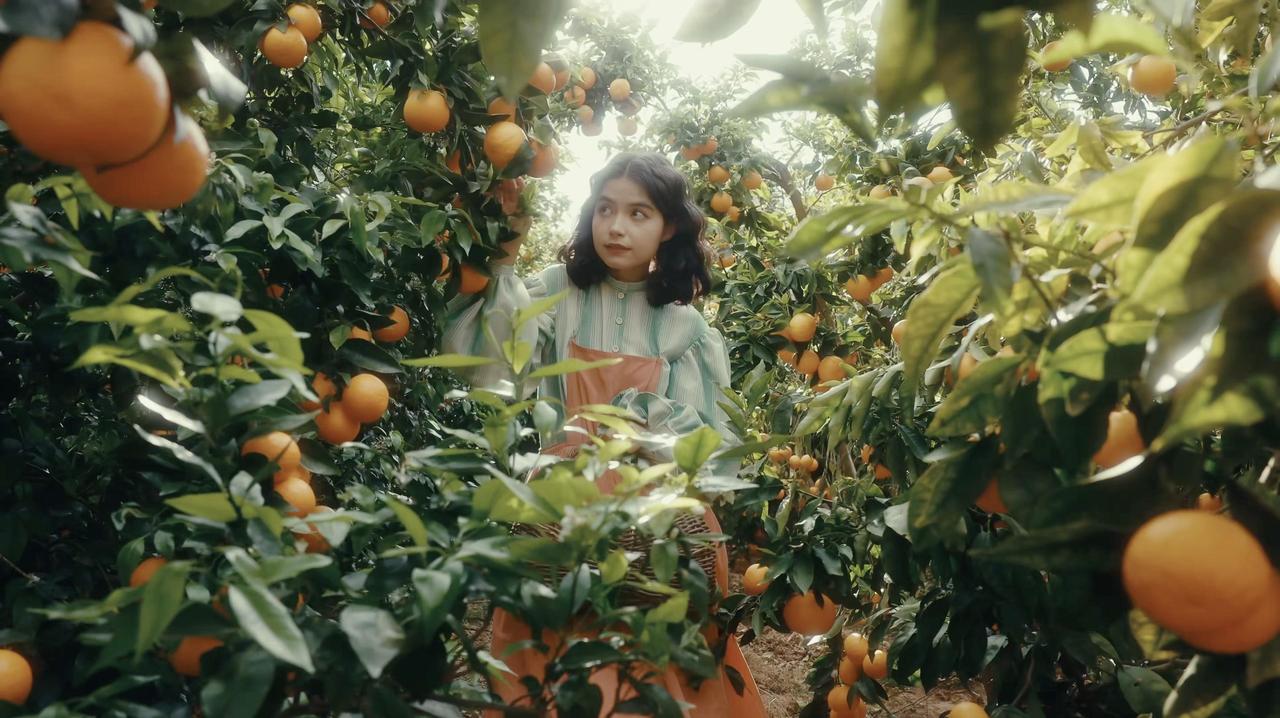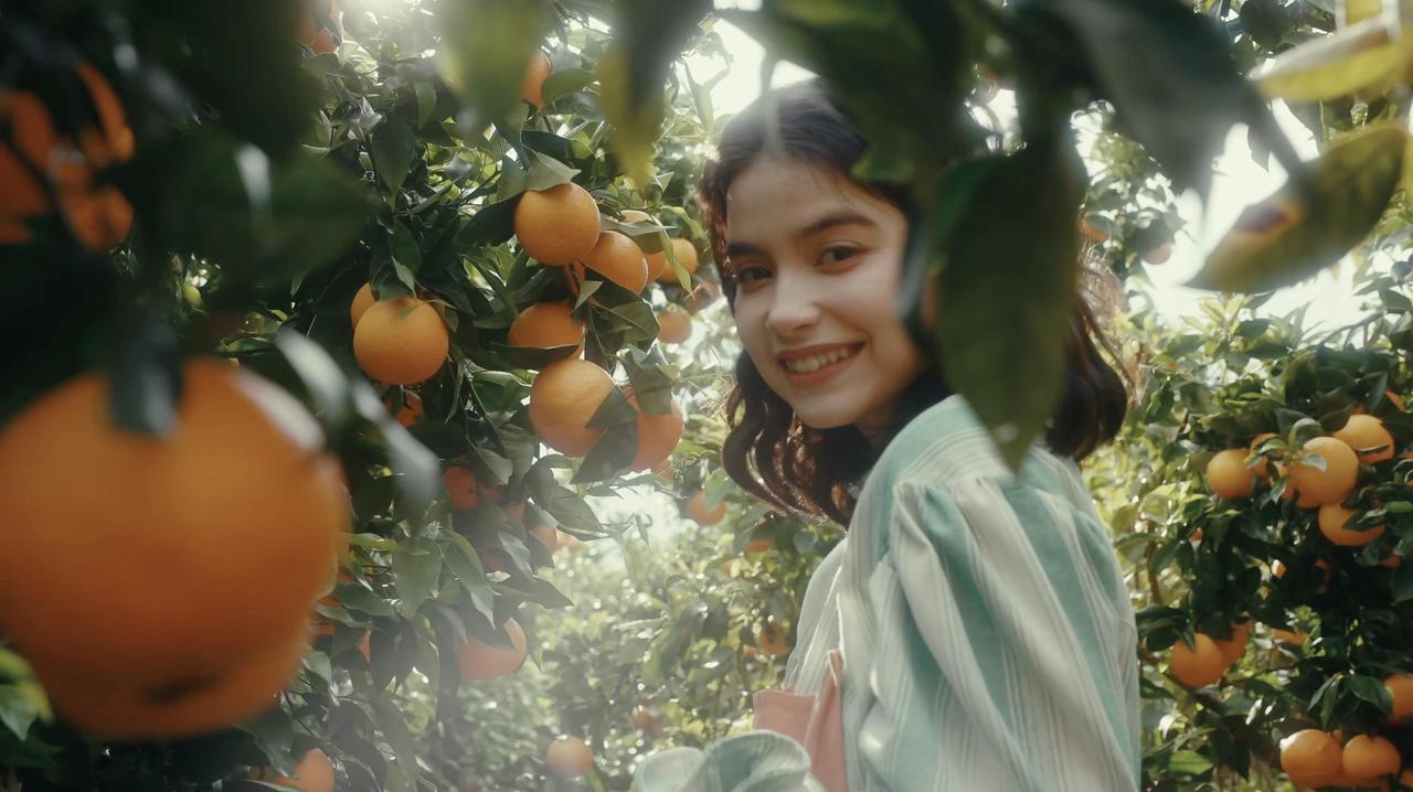 画面中,少女的浅绿条纹上衣与橘色果实形成自然色彩呼应,浅橙肤色与暖调光线相互映衬,让整体色彩协调且富有层次,避免了果园场景易出现的色彩杂乱问题。