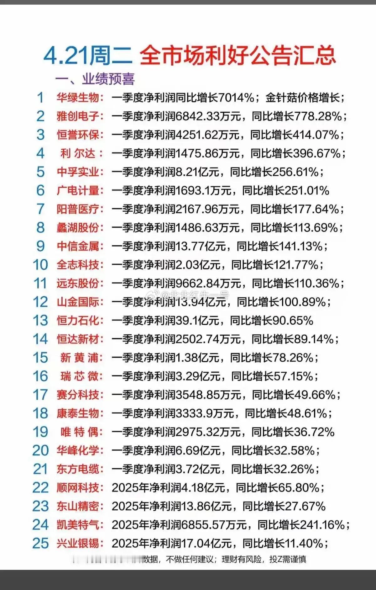 4月21日晚间多家公司发布公告,部分企业一季度业绩预喜,华绿生物、雅创电子等增幅居前,也有重大订单、项目公告落地,如正业科技、腾达建设等。技术突破方面,宁德时代发布快充电池,华润双鹤药品获批。同时算力、6G相关政策推进,稀土价格走强,市场主线消息面偏暖。以上为公开信息整理,不构成投资建议,理性看待公告对个股的影响。市场公告
