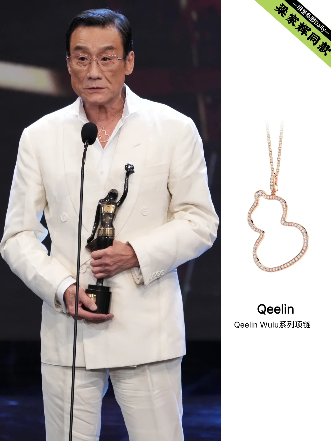 颁奖典礼现场他以黑白两套造型亮相,红毯上一身利落全黑西装搭配墨镜气质矜贵,颁奖环节的白色西装则尽显儒雅风范与影帝风采,两套造型都佩戴了Qeelin经典Wulu葫芦吊坠,超级抢镜。这款珠宝寓意“福禄与好运”,曾陪伴张曼玉亮相2004年戛纳红毯并摘下当年的影后桂冠,被誉为“影坛封神同款”。