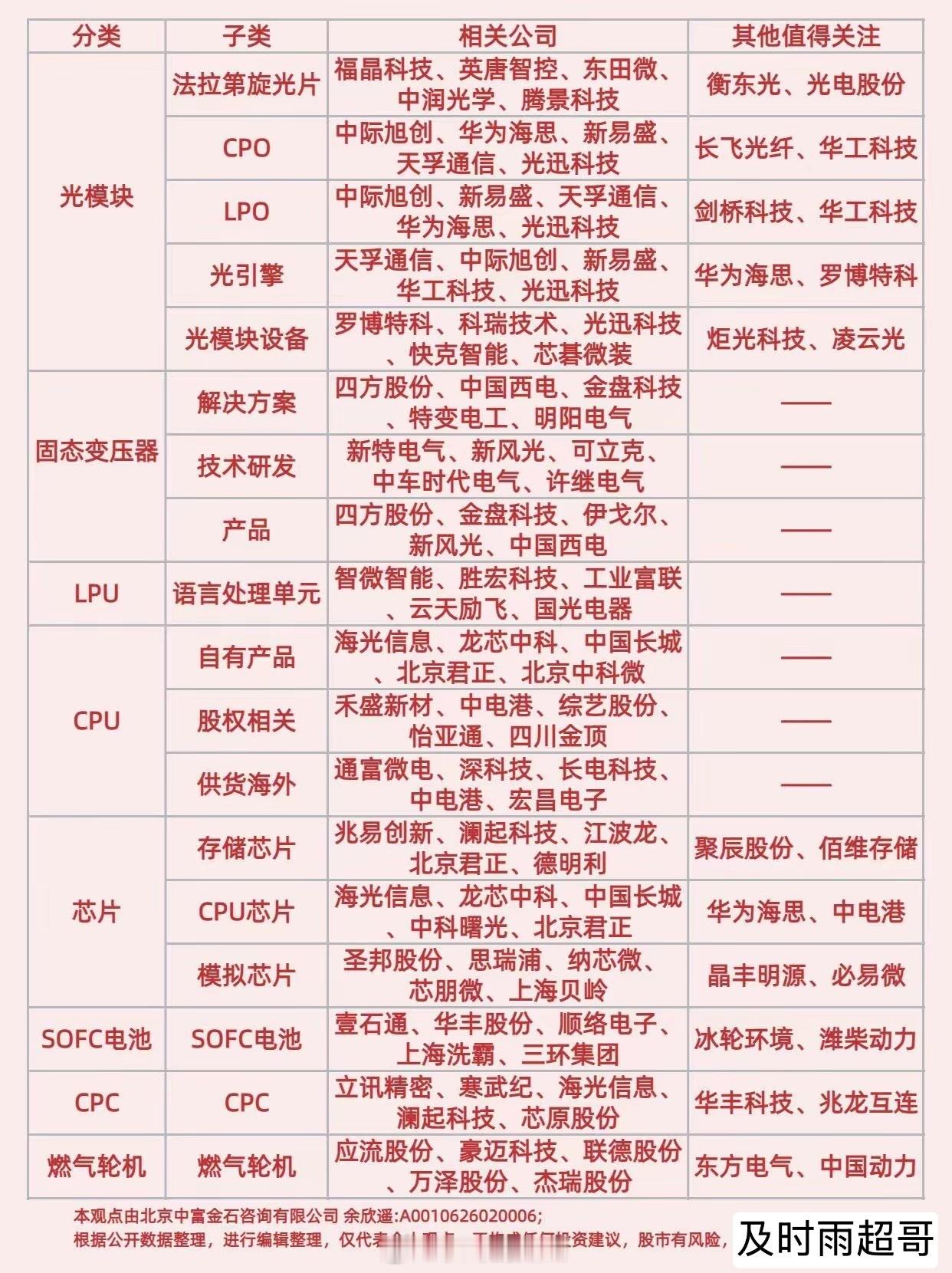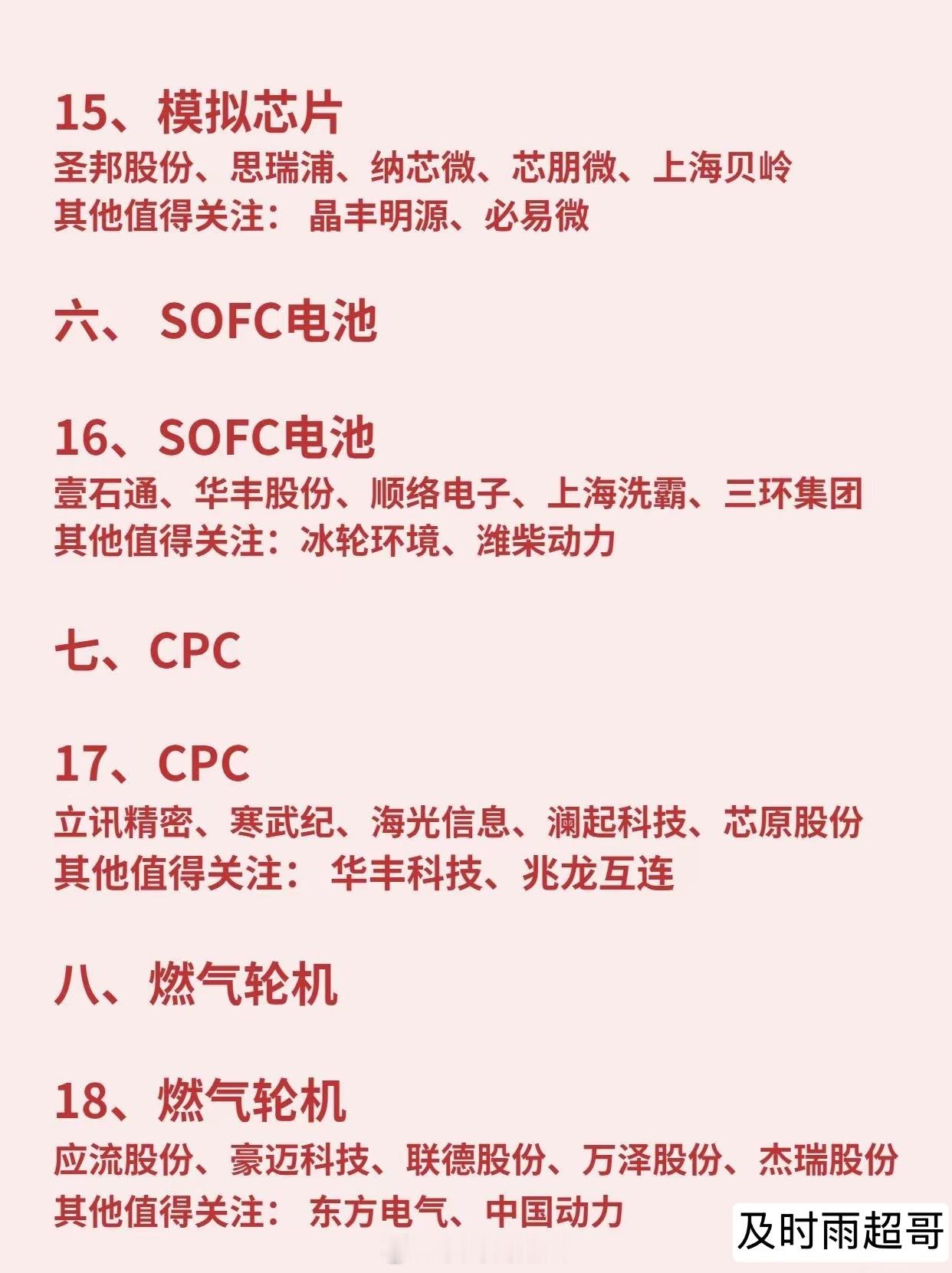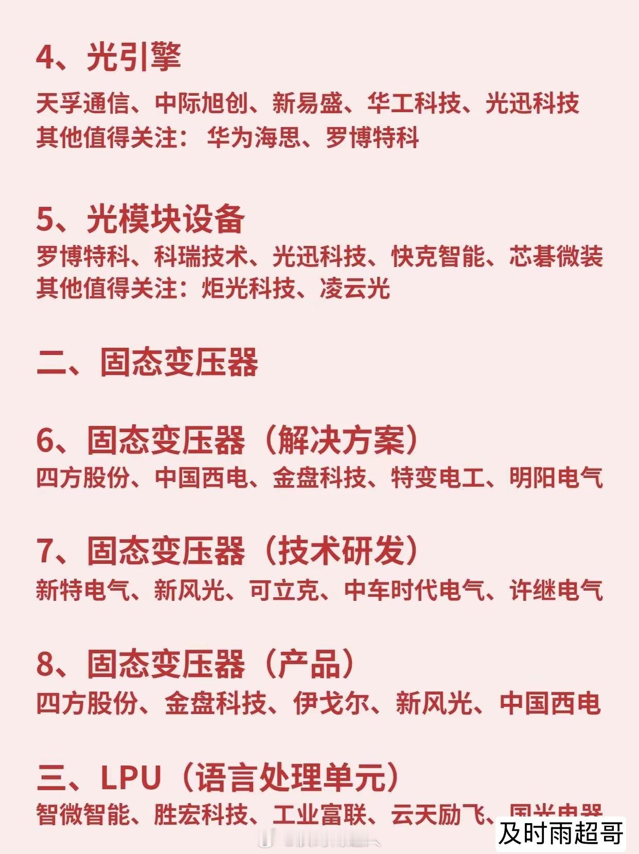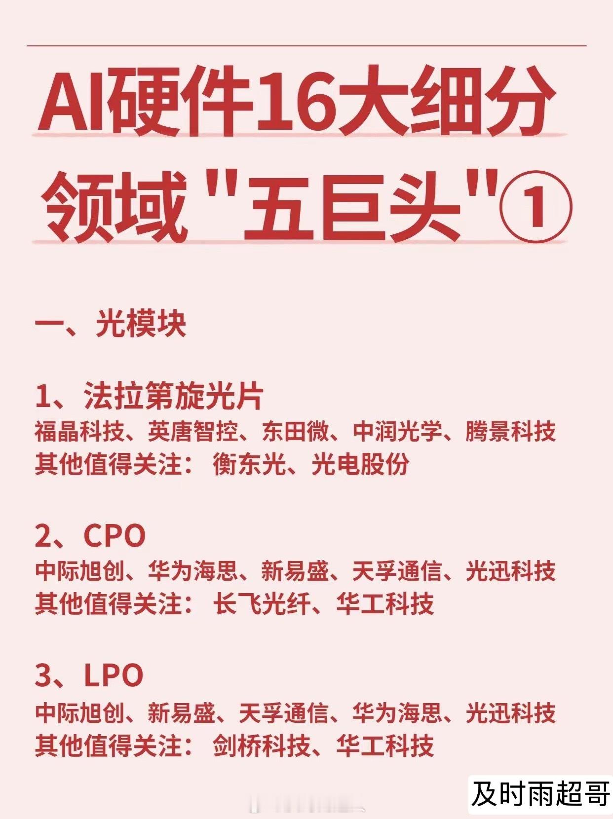 AI硬件16大细分领域热门公司1、法拉第旋光片福晶科技、英唐智控、东田微、中润光学、腾景科技2、CPO中际旭创、华为海思、新易盛、天孚通信、光迅科技3、LPO中际旭创、新易盛、天孚通信、华为海思、光迅科技4、光引擎天孚通信、中际旭创、新易盛、华工科技、光迅科技5、光模块设备罗博特科、科瑞技术、光迅科技、快克智能、芯碁微装6、固态变压器(解决方案)四方股份、中国西电、金盘科技、特变电工、明阳电气7、固态变压器(技术研发)新特电气、新风光、可立克、中车时代电气、许继电气8、固态变压器(产品)四方股份、金盘科技、伊戈尔、新风光、中国西电9、LPU(语言处理单元)智微智能、胜宏科技、工业富联、云天励飞、国光电器10、CPU(自有产品)海光信息、龙芯中科、中国长城、北京君正、北京中科微11.CPU(股权相关)禾盛新材、中电港、综艺股份、怡亚通、四川金顶12、CPU(供货海外)通富微电、深科技、长电科技、中电港、宏昌电子13、存储芯片兆易创新、澜起科技、江波龙、北京君正、德明利14、CPU芯片海光信息、龙芯中科、中国长城、中科曙光、北京君正15、模拟芯片圣邦股份、思瑞浦、纳芯微、芯朋微、上海贝岭16、SOFC电池壹石通、华丰股份、顺络电子、上海洗霸、三环集团17、CPC立讯精密、寒武纪、海光信息、澜起科技、芯原股份18、燃气轮机应流股份、豪迈科技、联德股份、万泽股份、杰瑞股份.⚠根据公开数据整理,仅作为科普,不作任何建议