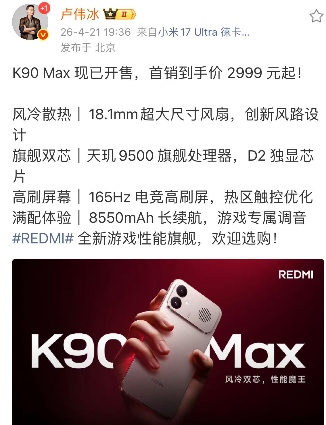 红米K90 Max 开售,首销到手价 2999 元起!国布价2549.15元起。 有一说一,8550mAh续航是真香啊! 小米集团总裁卢伟冰称定价2999元,属于亏损价。[捂脸] 隔壁桌同事:小米这波操作是赔本赚吆喝嘛?[抠鼻]