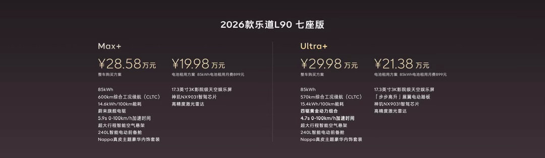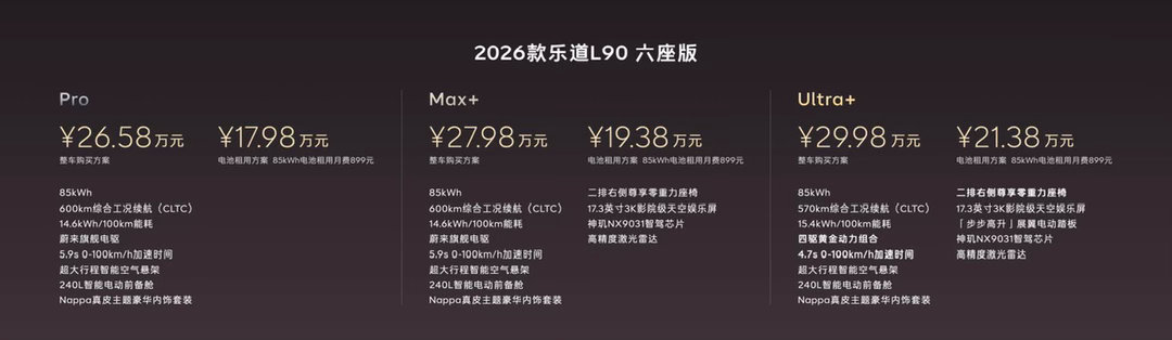 旗舰智能,领先一代,2026款乐道L90上市,整车购买26.58万元起,电池租用方式购买,17.98万元起。还限时尊享至高总价值超58,000元购车权益!大家觉得这个价格怎么样乐道L90蔚来世界模型版乐道汽车蔚来乐道L90