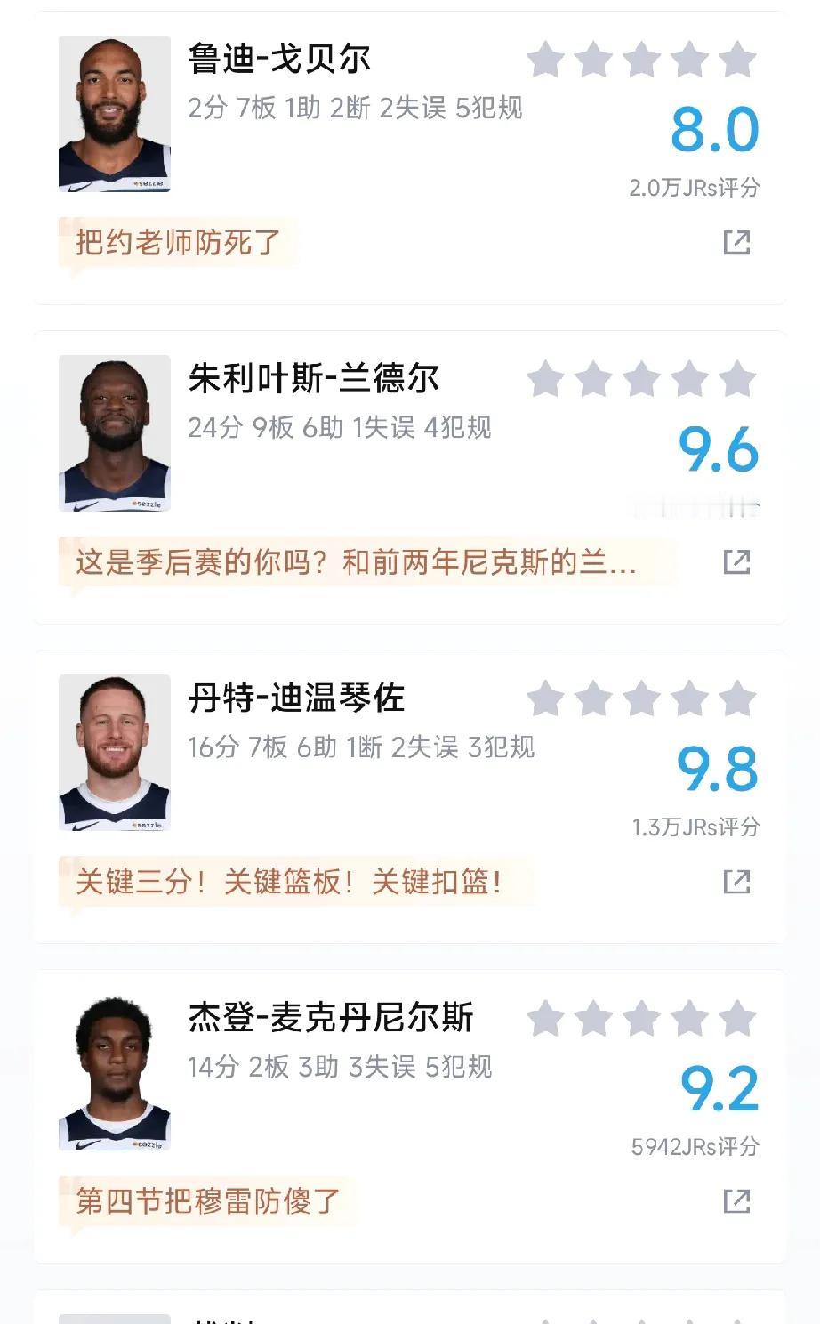 赛后球迷点评掘金森林狼球员: