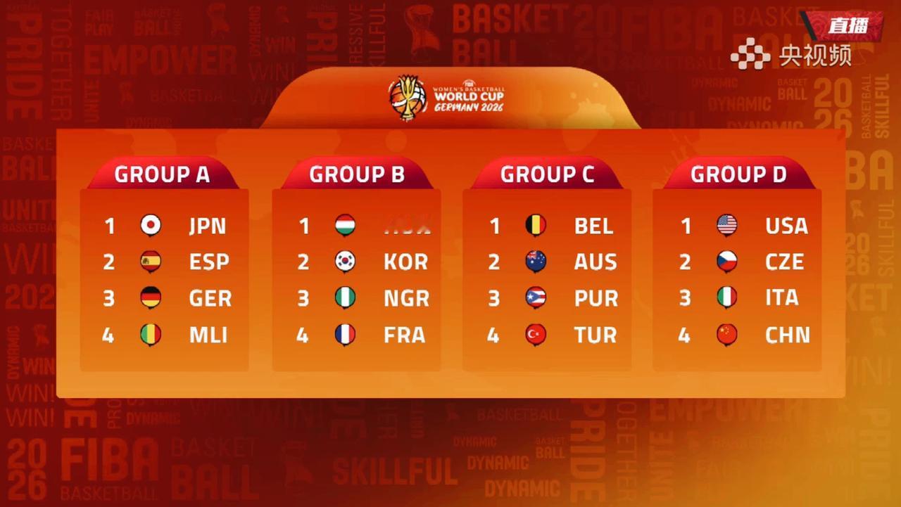 北京时间4月22日 0:00,2026 年女篮世界杯抽签仪式在德国柏林结束。中国女篮与美国、意大利、捷克分在 D 组。