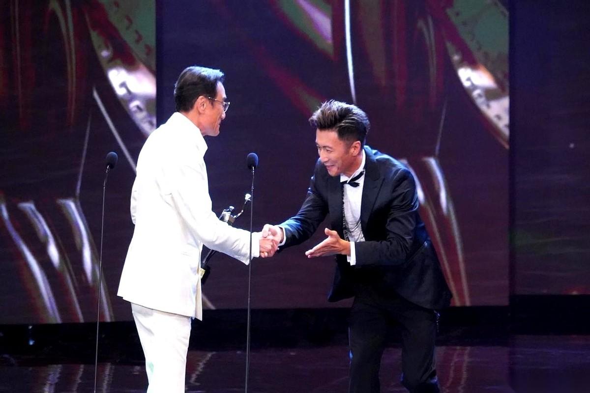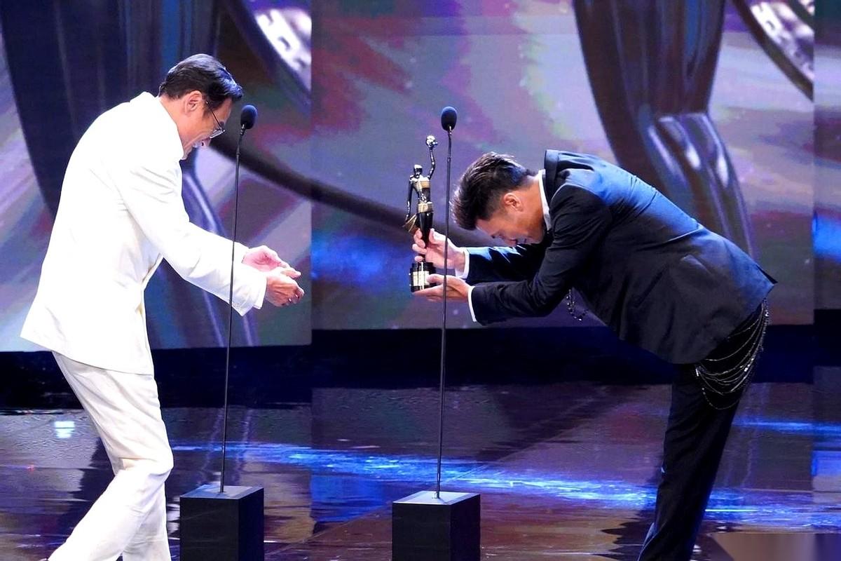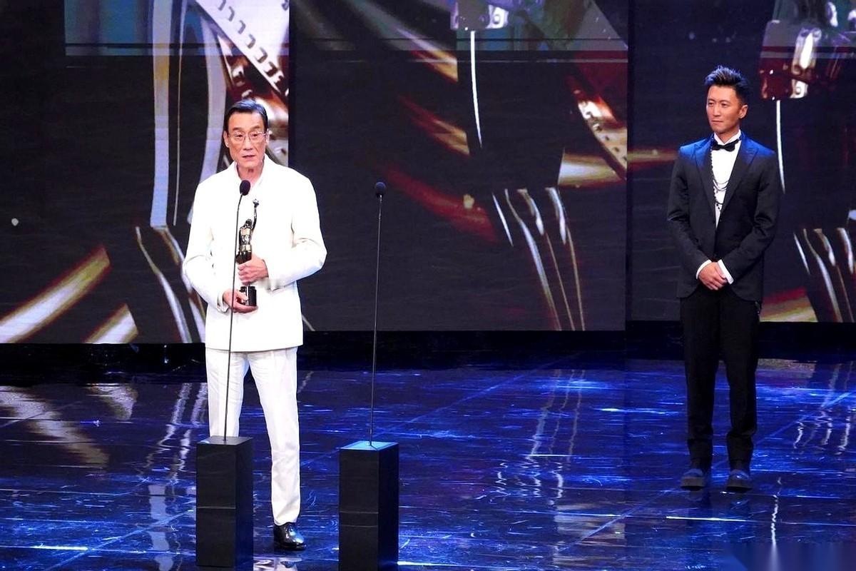 梁家辉接过奖杯,两人并肩而立。一个是一身白的影坛常青树,举手投足全是松弛感;一个是瘦削干练的后起之秀,满脸写着成熟。