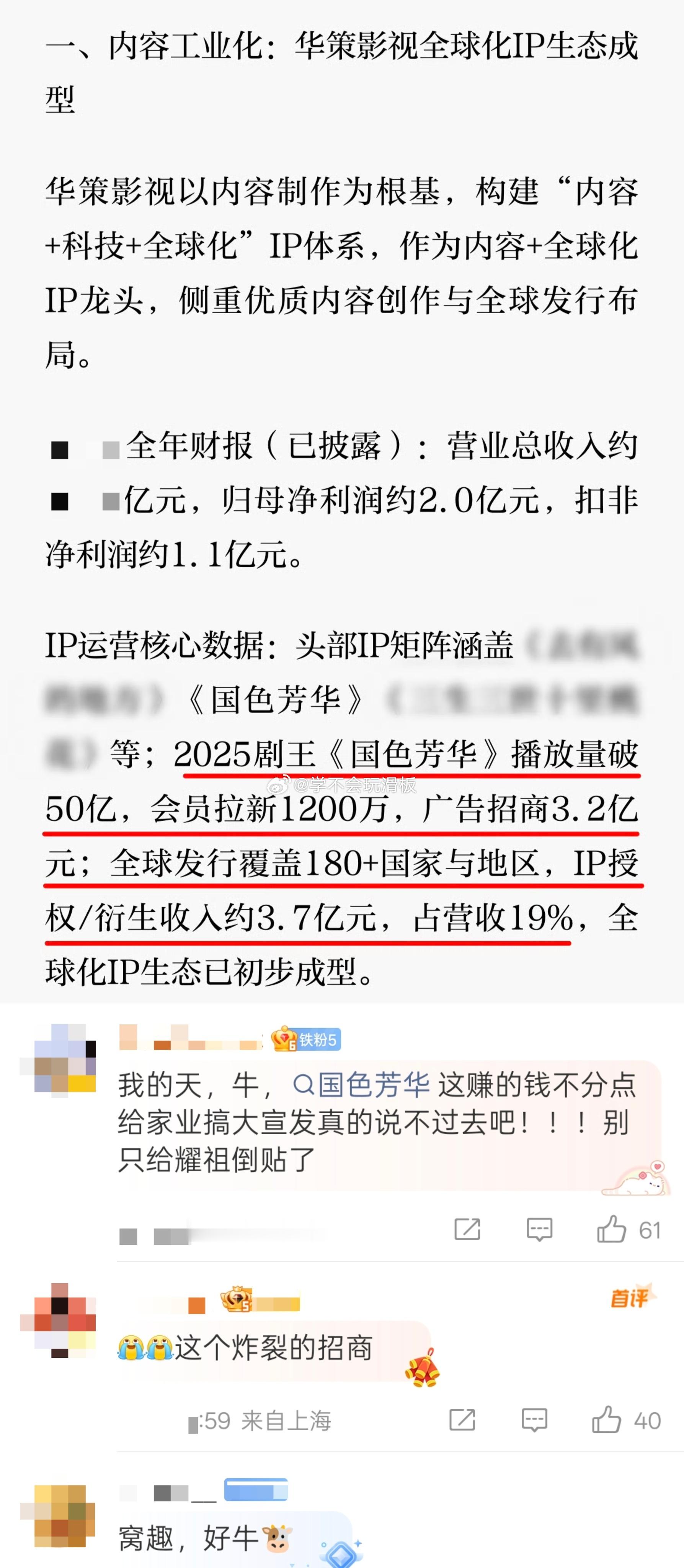 杨紫、李现《国色芳华》播放量破50亿,会员拉新1200万,广告招商3.2亿元,全球发行覆盖180➕国家与地区,ip授权收入约3.7亿,占华策营收19%。