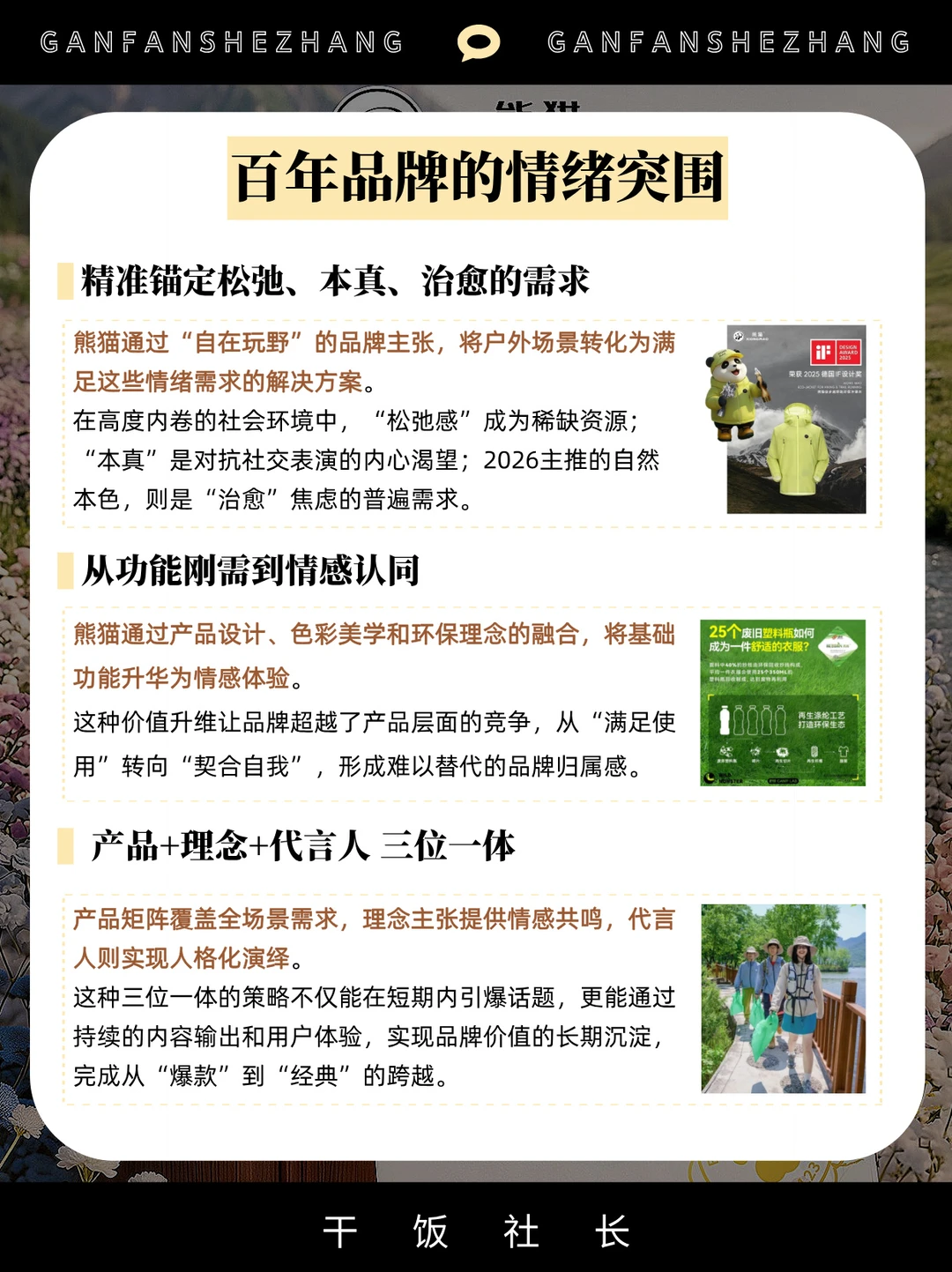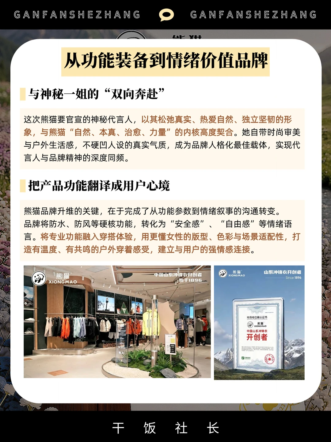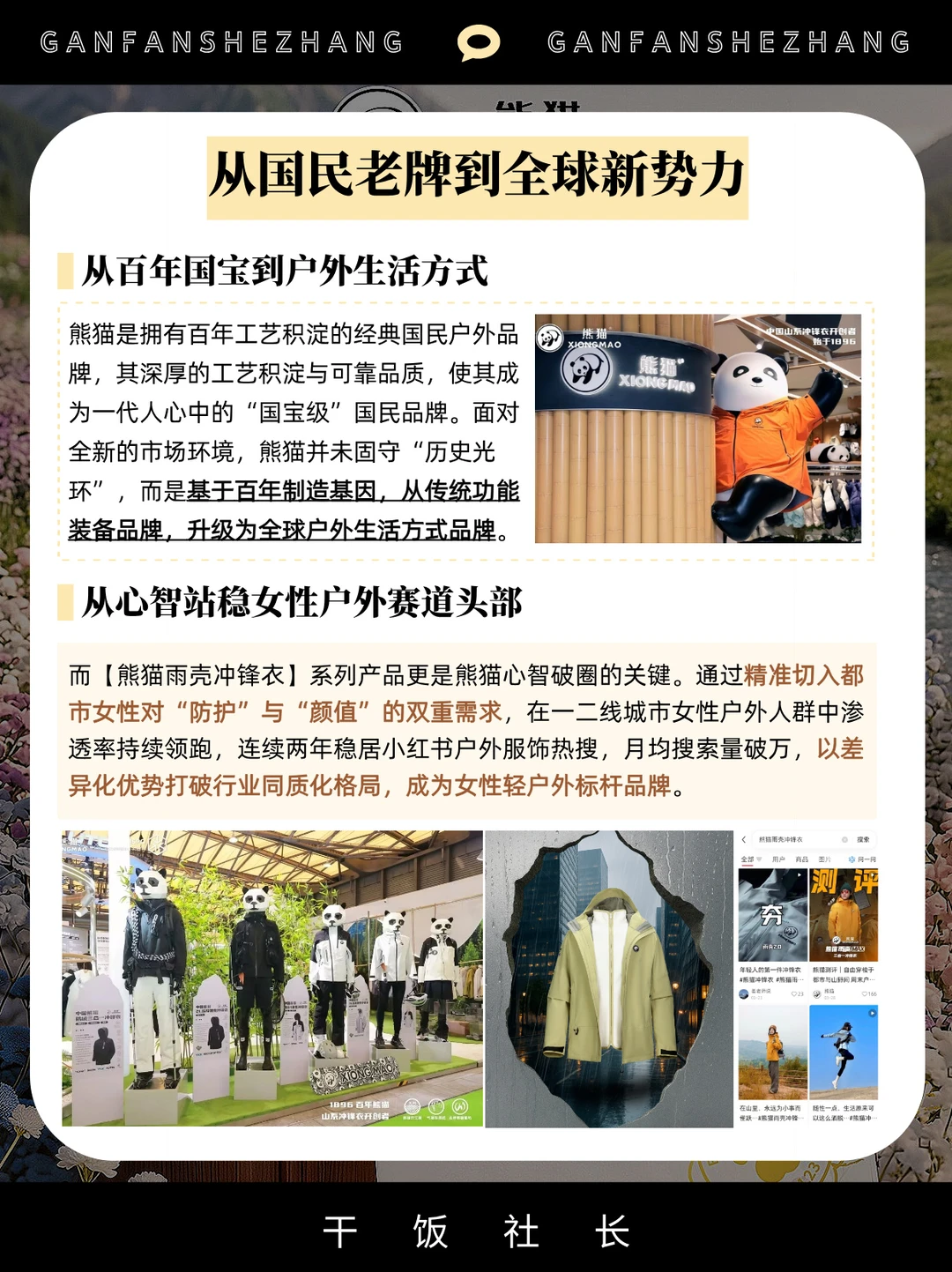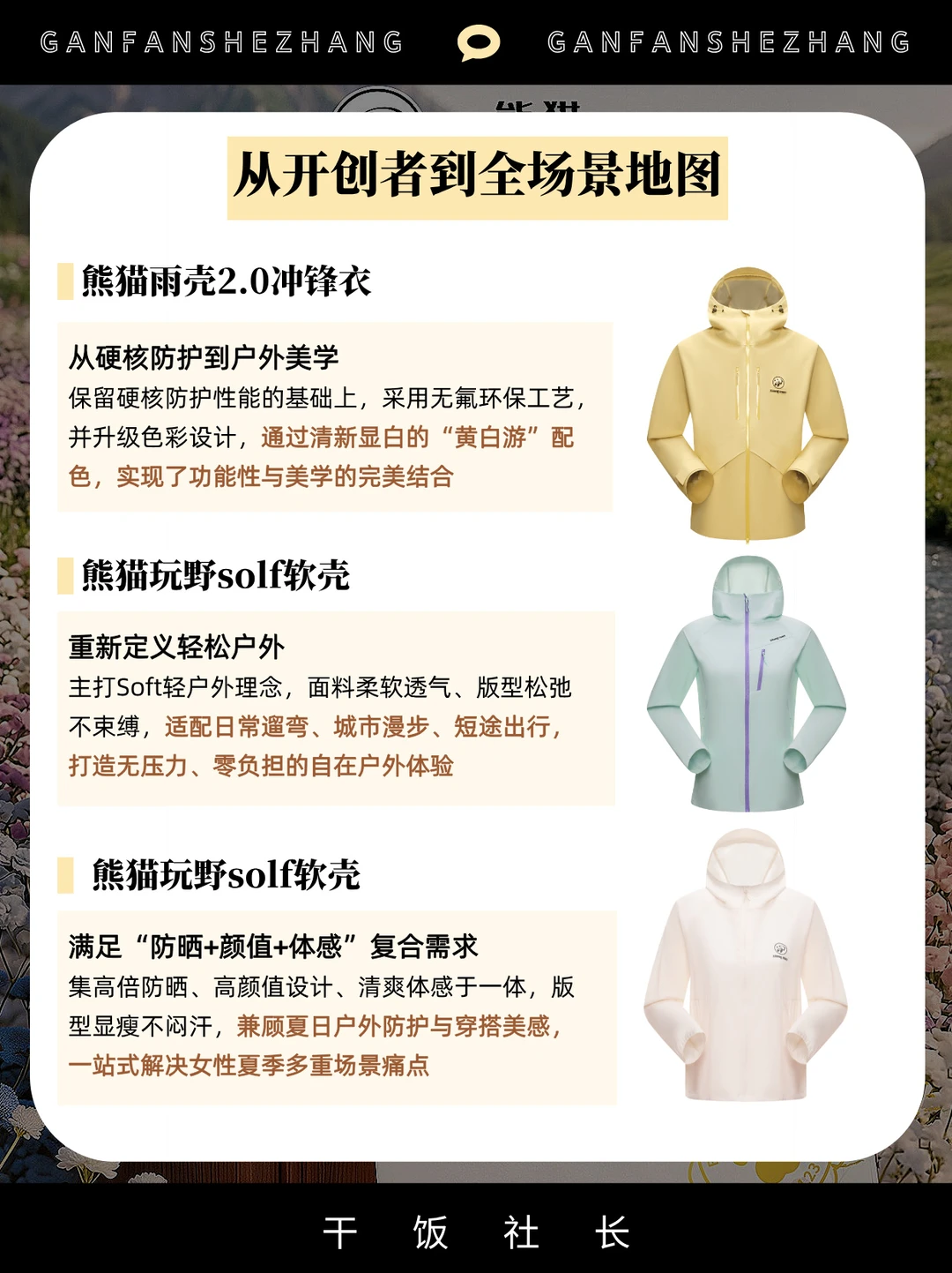 ✅其次,是产品的进化。从一件火出圈的【熊猫雨壳冲锋衣】,到覆盖都市漫步、山野探索的全场景产品地图,熊猫在为走出去的每一种心情设计产品。