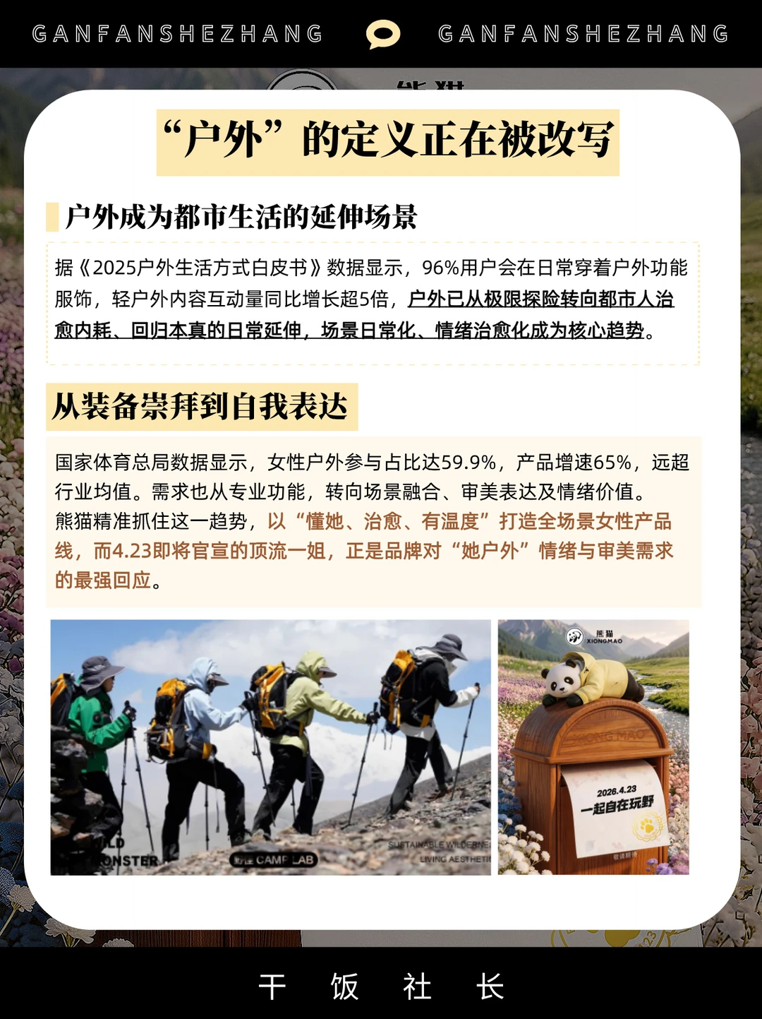 细扒之后发现,这远非一次简单的明星代言。更是熊猫一次蓄力已久的战略表达。过去几年,我们见证了熊猫从一个熟悉的“国宝级”户外品牌,悄然蜕变为一个倡导时尚户外生活方式的新朋友。从自然本色的探索到这次官宣,正是它向大众清晰传递这种转变的关键时刻。