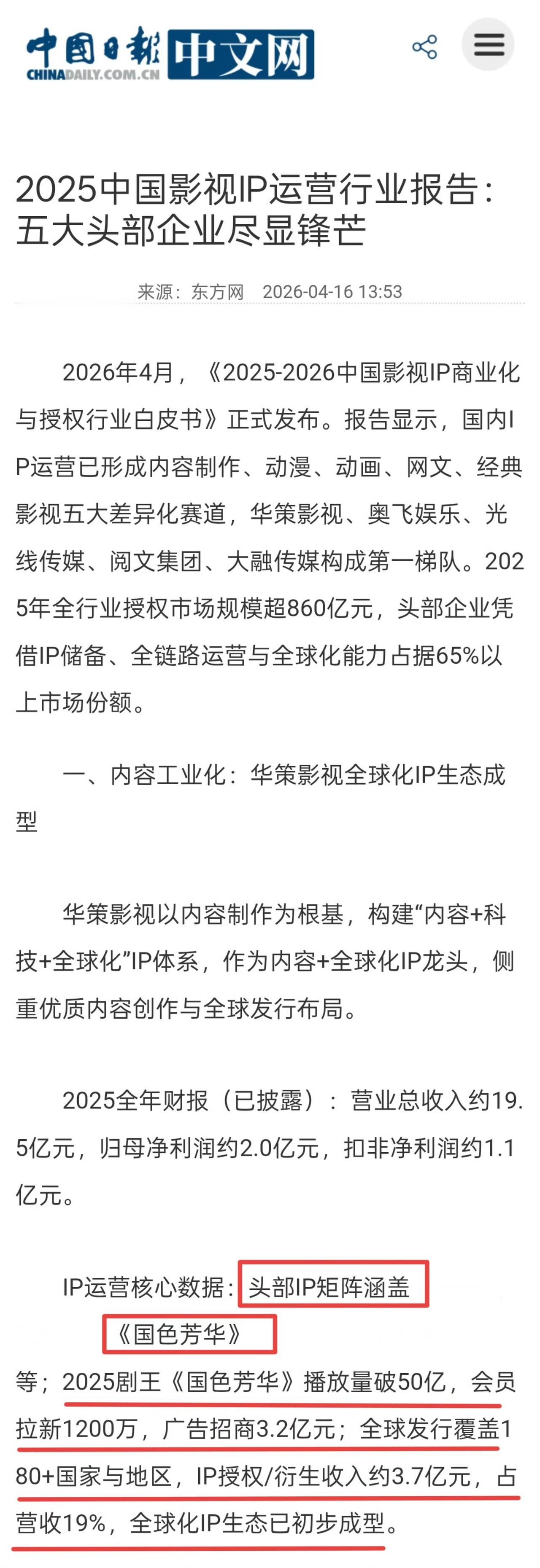 中国日报网发文 《2025-2026中国影视IP商业化与授权行业白皮书》中提到2025头部IP剧王《国色芳华》播放量破50亿,会员拉新1200万人(成为20年以来所有平台剧集拉新第一),直接给芒果台和华策影视赚了6亿多,占华策营收总额的五分之一,杨紫和李现主演的《国色芳华》