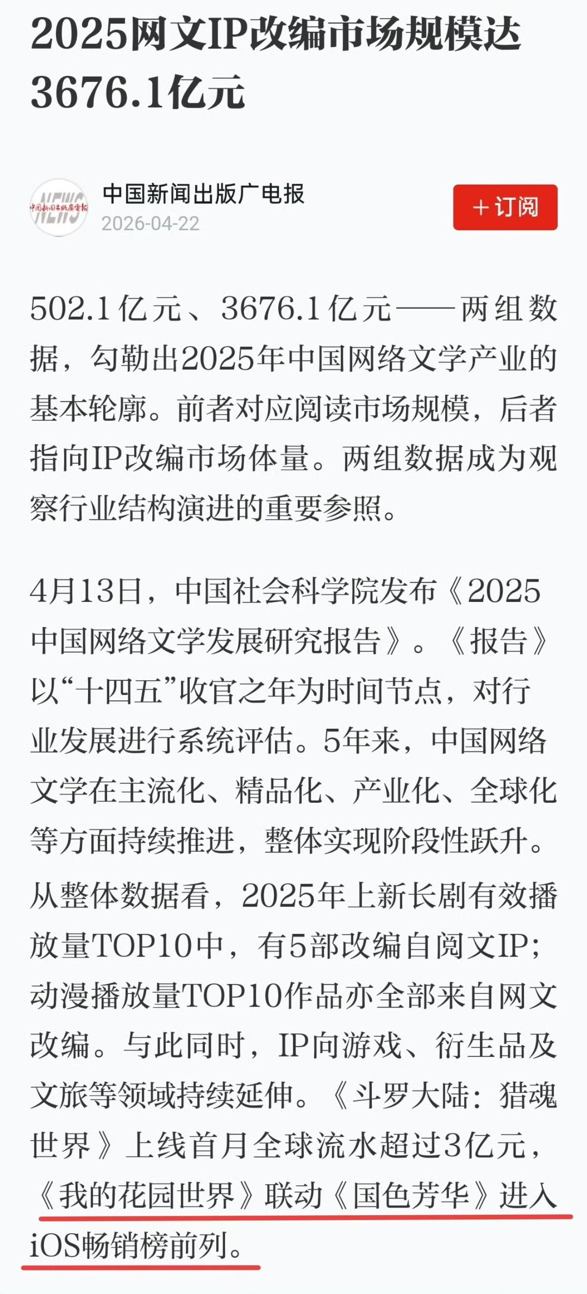此外,中国社会科学院发布《2025中国网络文学发展研究报告》中也提到《我的花园世界》手游联动《国色芳华》也进入iOS畅销榜前列。