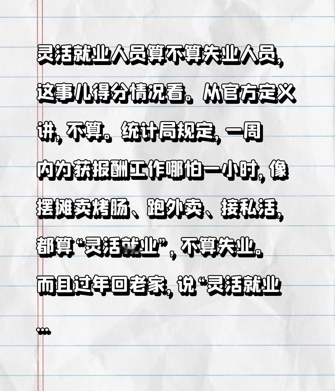 灵活就业人员算不算失业人员,这事儿得分情况看。从官方定义讲,不算。统计局规定,一周内为获报酬工作哪怕一小时,像摆摊卖烤肠、跑外卖、接私活,都算“灵活就业”,不算失业。而且过年回老家,说“灵活就业”比说“失业”有面子,亲戚一听还觉得你是“独立合伙人”。