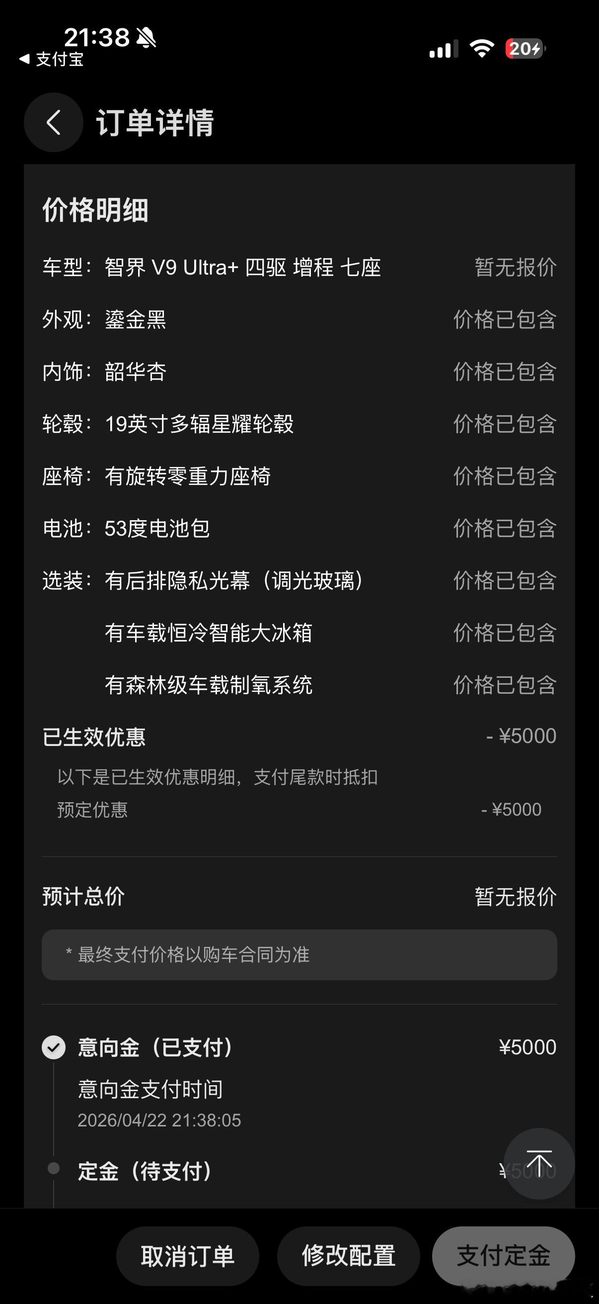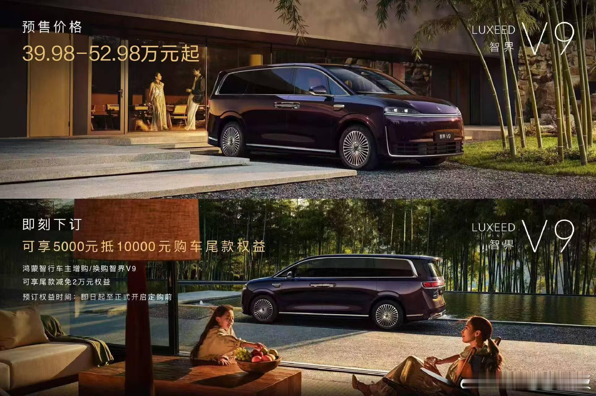 定了台智界的V9 买了个顶配 这回我儿子小金豆终于有自己的小车车了预售价39.98万-52.98万,即刻下订,可享5000元意向金抵10000元尾款;鸿蒙智行车主增购/换购智界V9,可享尾款减免2万元权益!跟姚老板混一天吃9顿 杭州