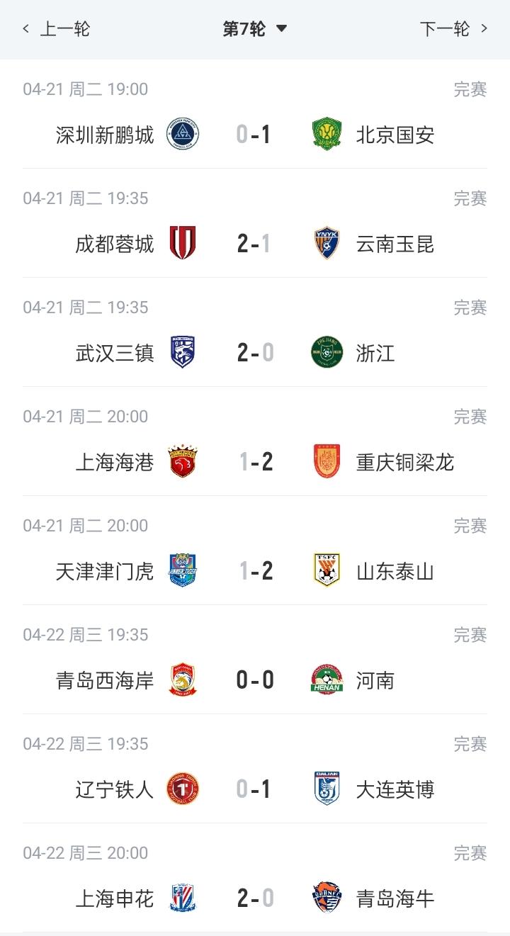 中超最新积分榜:蓉城、铜梁龙、英博位列前三 申花积7分升至第5,海牛、津门虎仍为负分