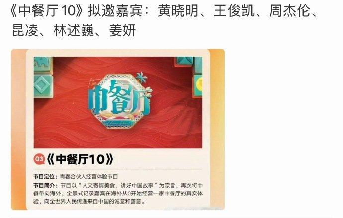 网传中餐厅10嘉宾中餐厅10网传嘉宾 《中餐厅10》拟邀嘉宾:黄晓明、王俊凯、周杰伦、昆凌、林述巍、姜妍