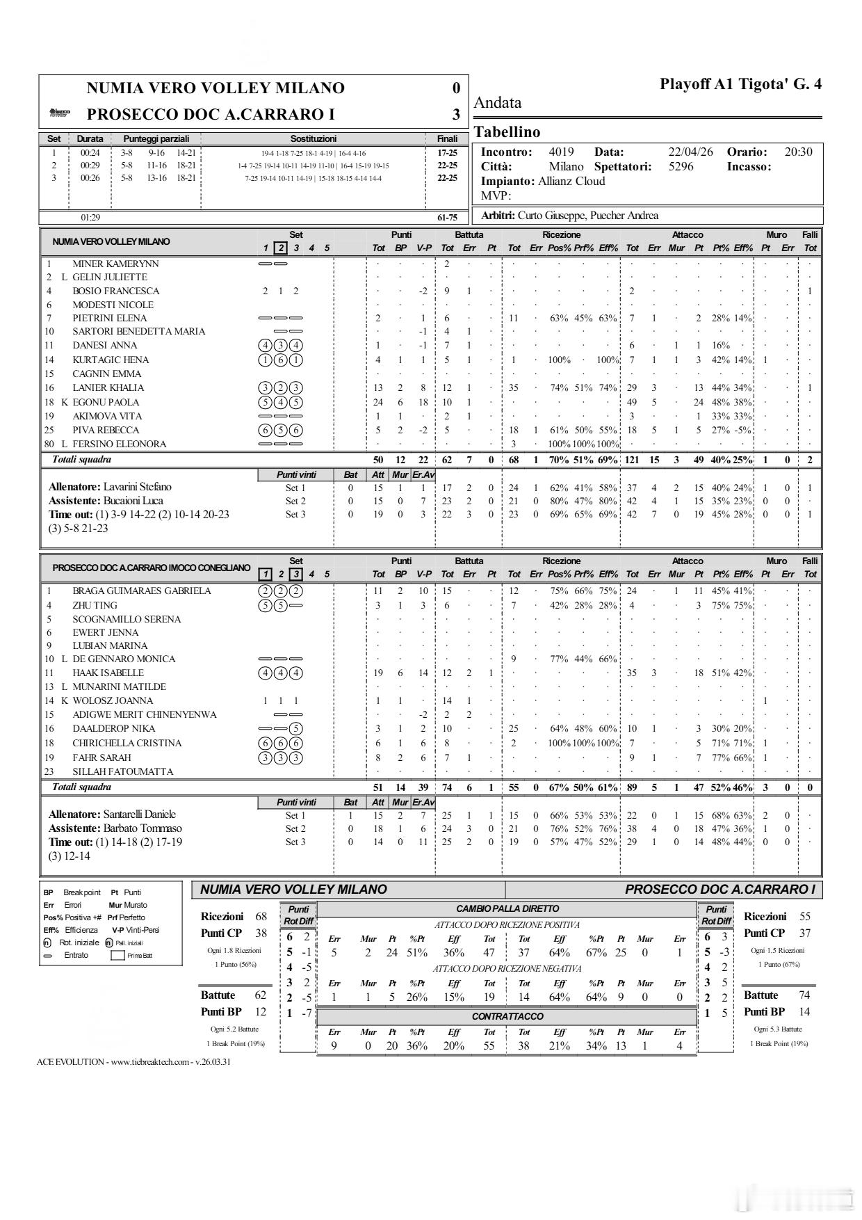 国际排坛动态科内利亚诺意甲女排联赛决赛第4场:科内利亚诺客场 3-0(25-17/25-22/25-22)米兰 ,恭喜朱婷,恭喜科内利亚诺!科内利亚诺总场分3-1夺冠科内利亚诺-米兰进攻:47-49;拦网:3-1;发球:1-0;自失:11-24哈克19分 35扣18中 3失误 1发;加比11分 24扣11中 1被拦;法赫尔8分 9扣7中 1失误 1拦;齐里切拉6分 7扣5中 1拦;达尔德罗普3分 10扣3中 1失误;朱婷3分 4扣3中;沃沃什1分 1拦艾格努24分 49扣24中 5失误;拉内尔13分 29扣13中 3失误;皮瓦5分 18扣5中 5失误1被拦;库尔塔吉奇4分 7扣3中 1失误1被拦 1拦;皮耶特里尼2分 7扣2中 1失误;阿基莫娃1分 3扣1中;达内西1分 6扣1中 1被拦朱婷