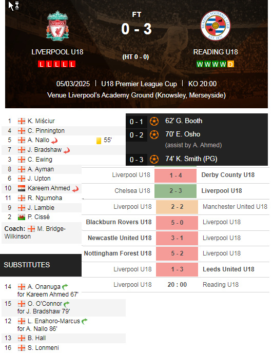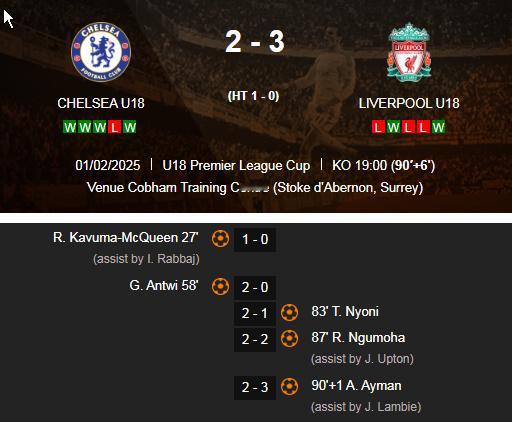 利物浦青训 U18联赛杯,水晶宫点球大战战胜曼联,首次捧杯,这支队伍里有几名主力也会参加周末在科克比的U21首轮淘汰赛……上赛季尼奥尼和恩古莫哈联手曾帮助U18在1/4决赛逆转切尔西,却在半决赛被雷丁羞辱,当时恩古莫哈打满全场,尼奥尼则被带去了巴黎坐板凳……而本赛季连小组赛都未出线