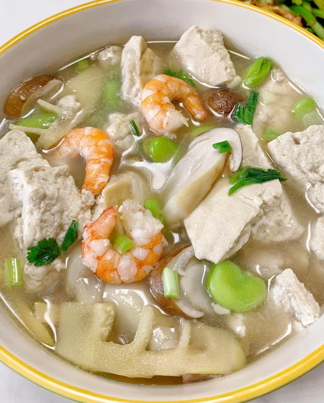 👉 做法:嫩豆腐切块;锅中烧水,加姜丝、虾皮(提鲜又补钙),水开后下豆腐,煮3分钟;加盐、白胡椒粉、葱花、几滴香油。