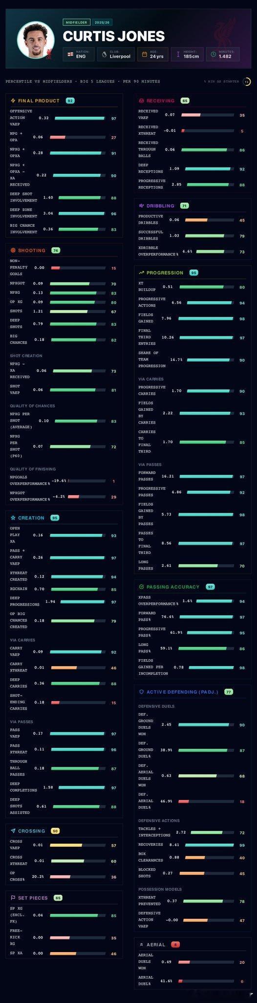 代表“防守对抗、拦截、抢断等主动防守贡献”。作为中场,他并非纯攻不防,而是能参与防守轮转,为防线提供支持。利物浦