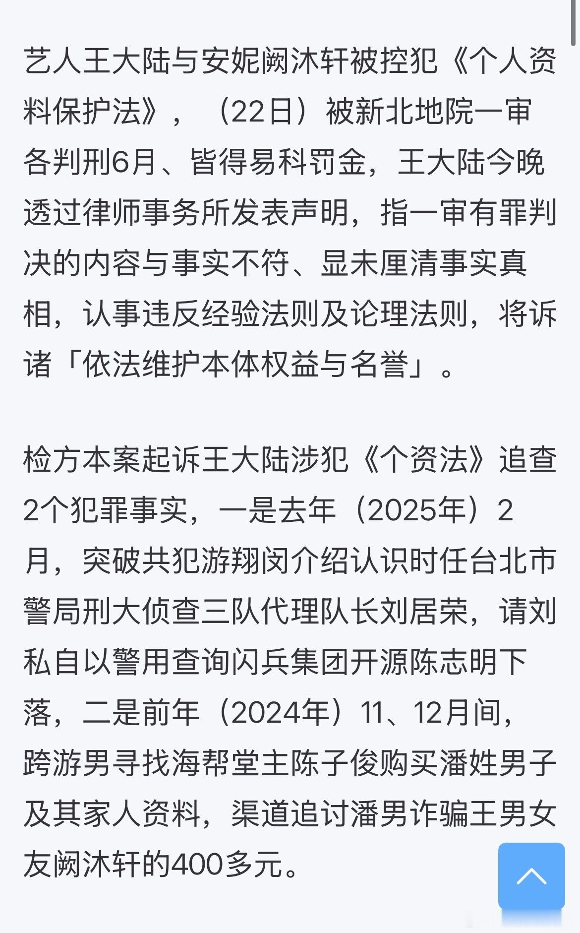 王大陆通过律师事务所发表声明,表示有罪判决内容与事实不符,会继续上诉。 (前情网