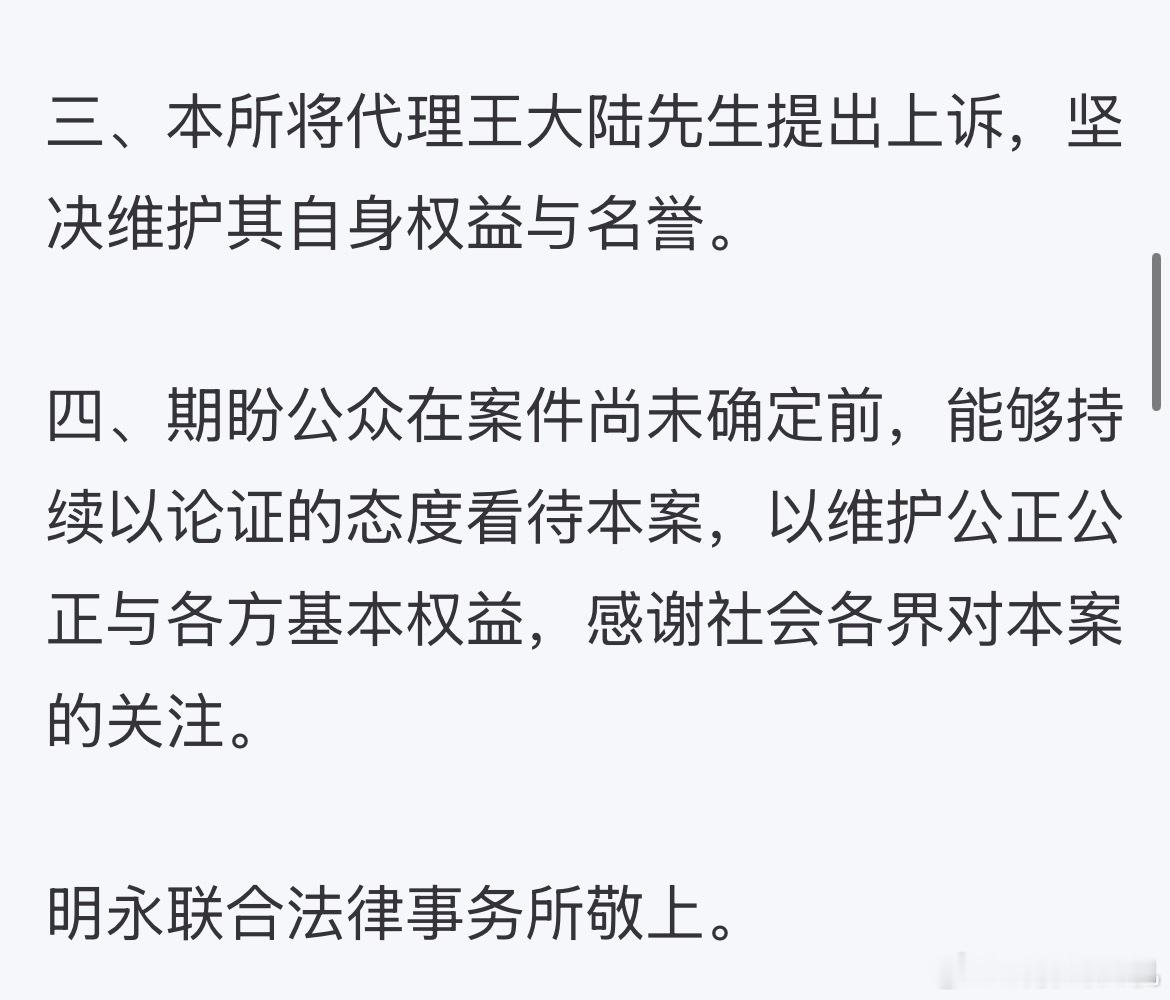 王大陆通过律师事务所发表声明,表示有罪判决内容与事实不符,会继续上诉。 (前情网页链接)