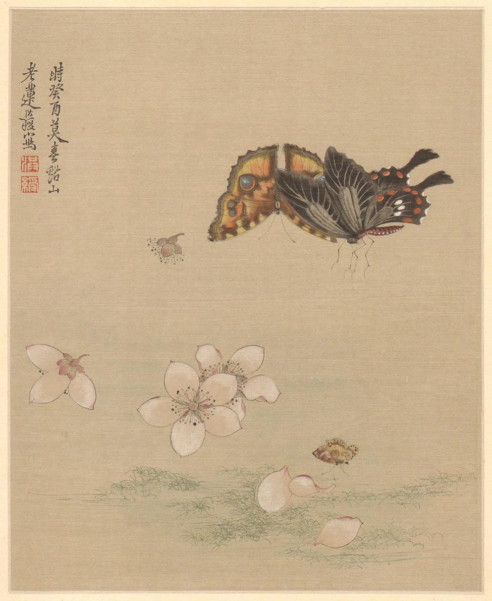 比起他张扬奇崛的人物,上海博物馆藏的这套《花鸟草虫图册》,更像他藏在风骨里的温柔一面。崇祯六年的绢素之上,没有磅礴气势,只以一花一叶、一虫一蝶,写尽极简的雅致与生机,淡而有味,静而有神。