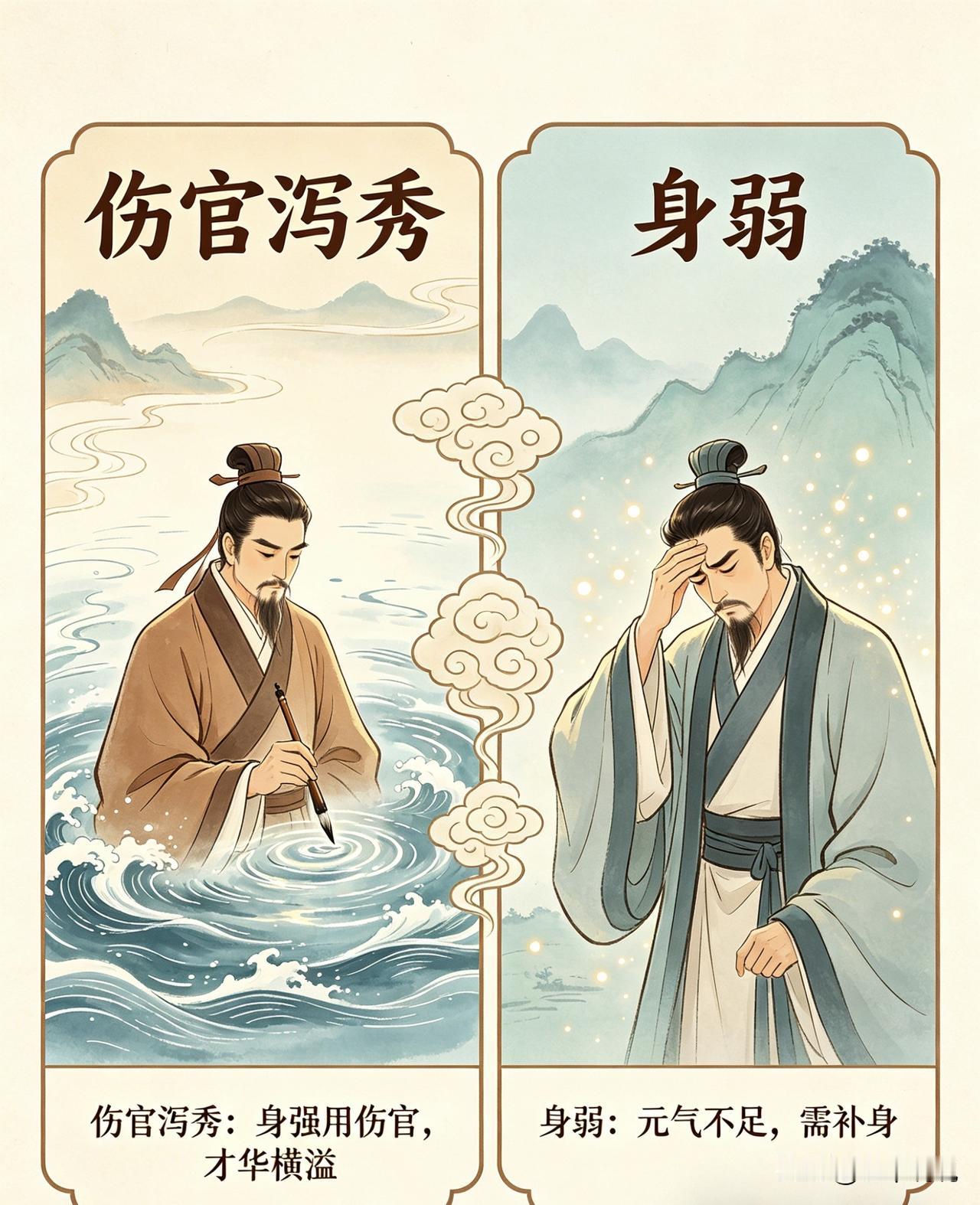 ▪️ 身弱再逢伤官:自身能量本就不足,再过度耗散于表达、创造,容易多思少行、疲惫乏力,即便有想法也难以落地践行;