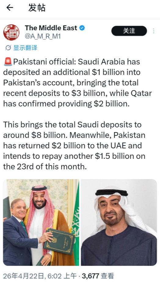 巴基斯坦官员表示:沙特阿拉伯向巴基斯坦账户追加存入了 10 亿美元,使得近期的总存款达到 30 亿美元。