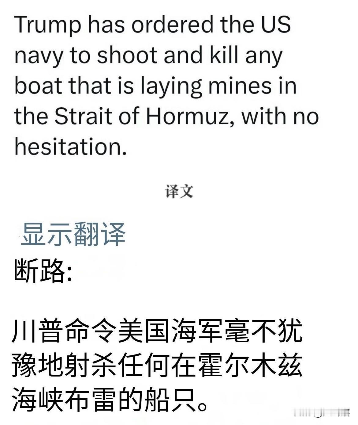 美国警告,一律击沉任何在霍尔木兹海峡布雷的船只! 美国总统特朗普向美军海军下令,对任何在霍尔姆尼海峡布雷的船只毫无犹豫的予以打击沉,无论是大船还是小船。 特朗斯表示,美国已完全控制了霍尔姆尼海峡,目前美军扫雷舰正在该海峡执行排雷作业。