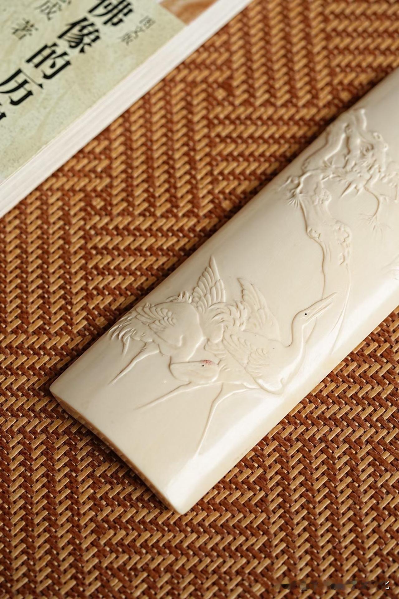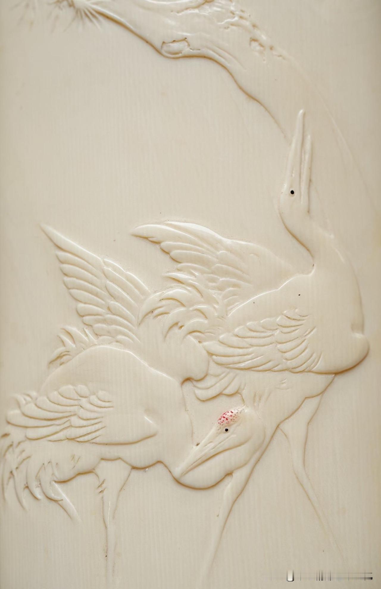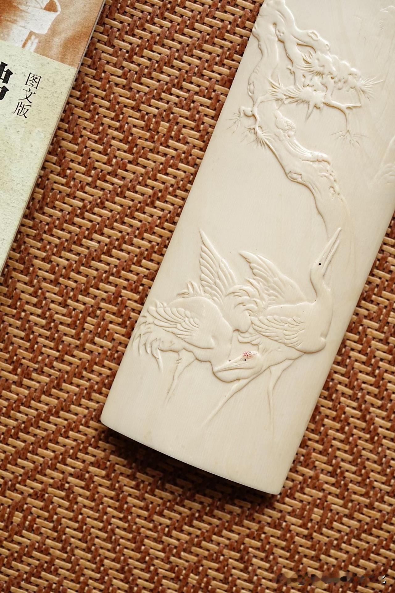 牙色温润如脂,不耀眼,却有一种慢慢透出来的光。松枝盘错,没有刻意的张扬,反而带着一点岁月的倔强;两只仙鹤轻落其间,羽翼收放有度,不争,却自有气场。那一瞬间,更像是停在时间里,而不是停在器物上。