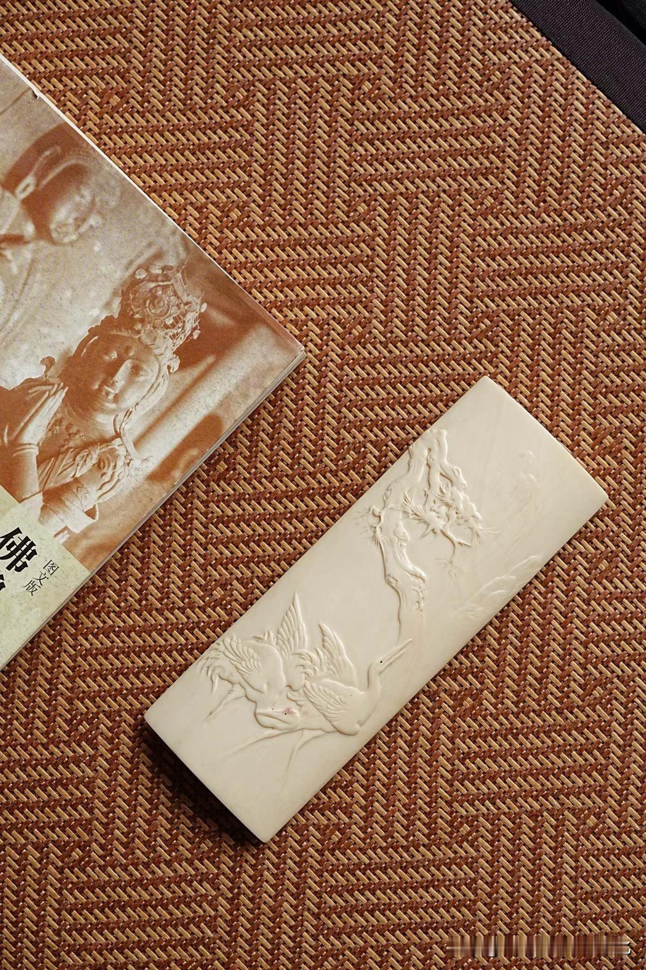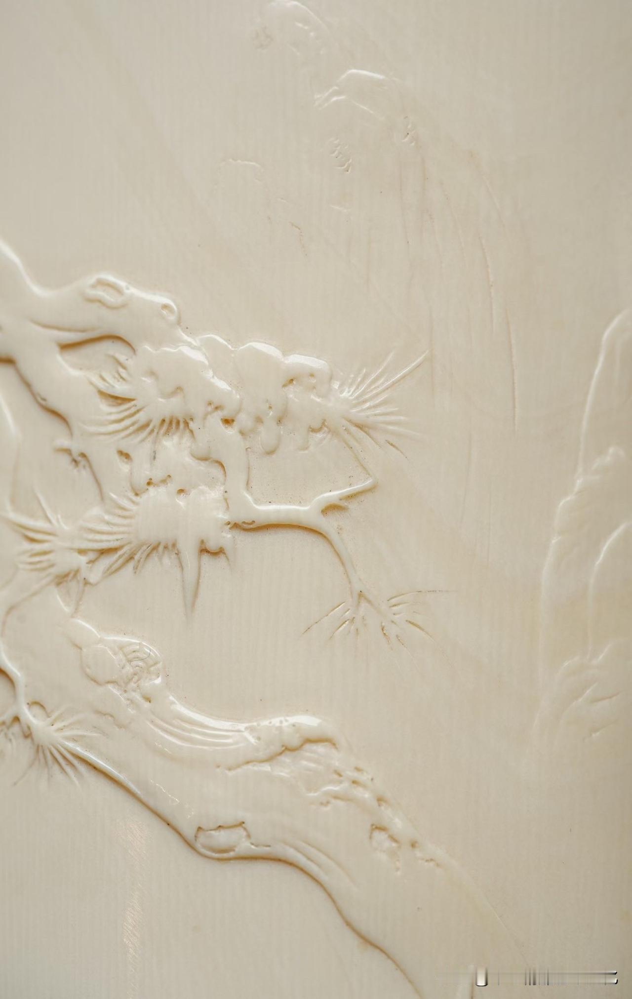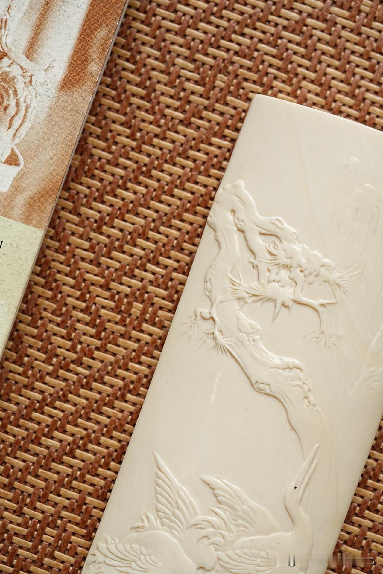 牙色温润如脂,不耀眼,却有一种慢慢透出来的光。松枝盘错,没有刻意的张扬,反而带着一点岁月的倔强;两只仙鹤轻落其间,羽翼收放有度,不争,却自有气场。那一瞬间,更像是停在时间里,而不是停在器物上。