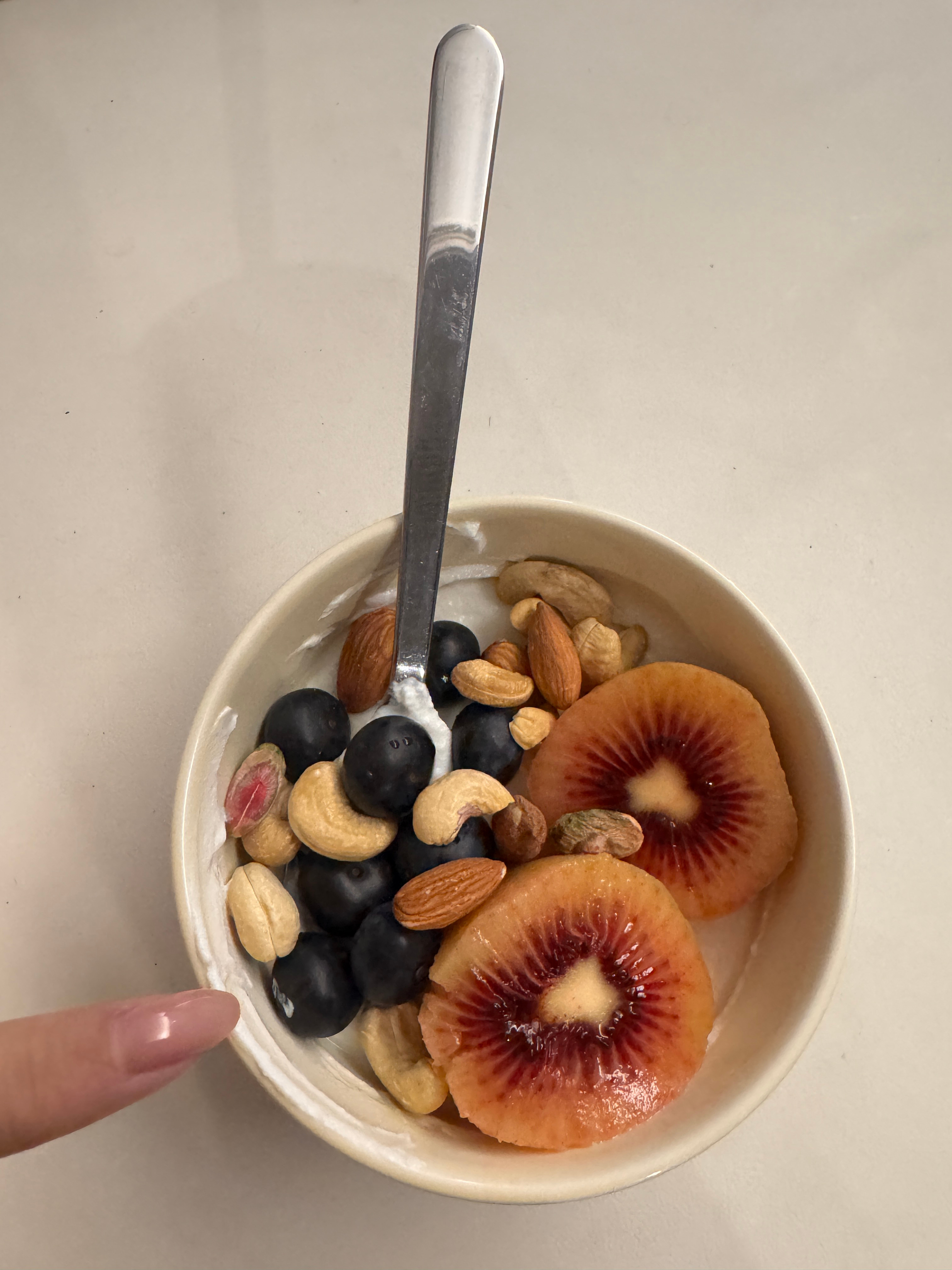 第一次尝试用无糖酸奶坐酸奶碗 其实就是往里加一些坚果 猕猴桃还有蓝莓哈哈非常简单