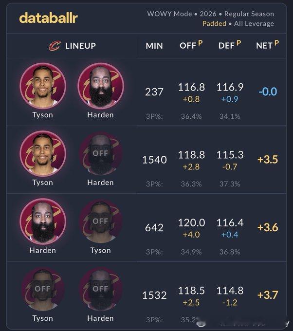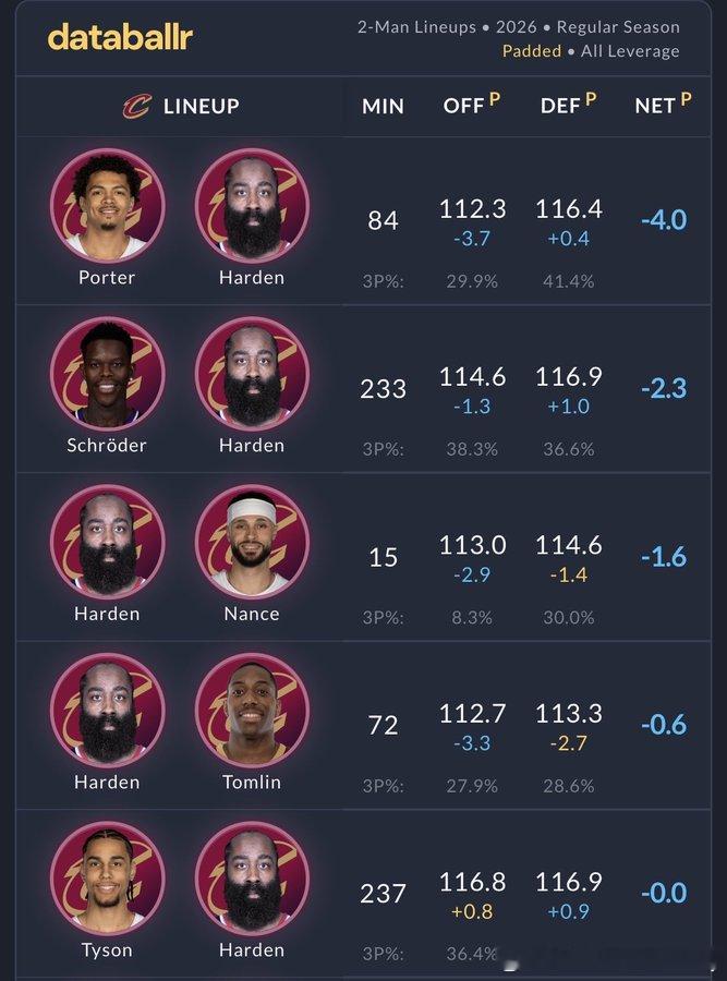在所有至少一起打了100分钟的双人组合里,只有施罗德和泰森搭配哈登时,净效率是负的。