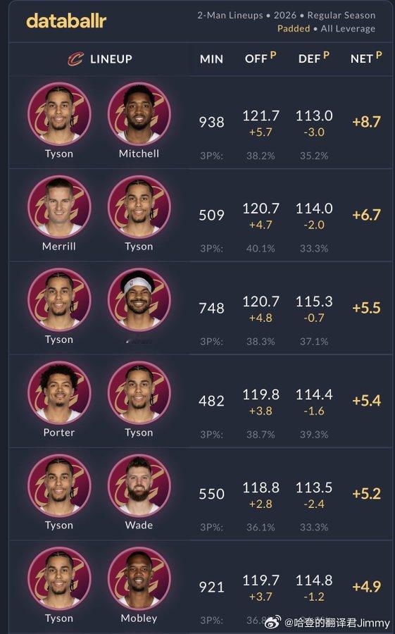 如果球队想把泰森的状态打出来,那么需要:1.多让他和米切尔一起打,减少和哈登的搭配时间(类似现在对施罗德的处理)2.同时给他搭配一些有尺寸的队友保护(韦德、阿伦、莫布里都在他最佳双人组合前六)3.再加上梅里尔在场(这对两人来说可能是互利的)