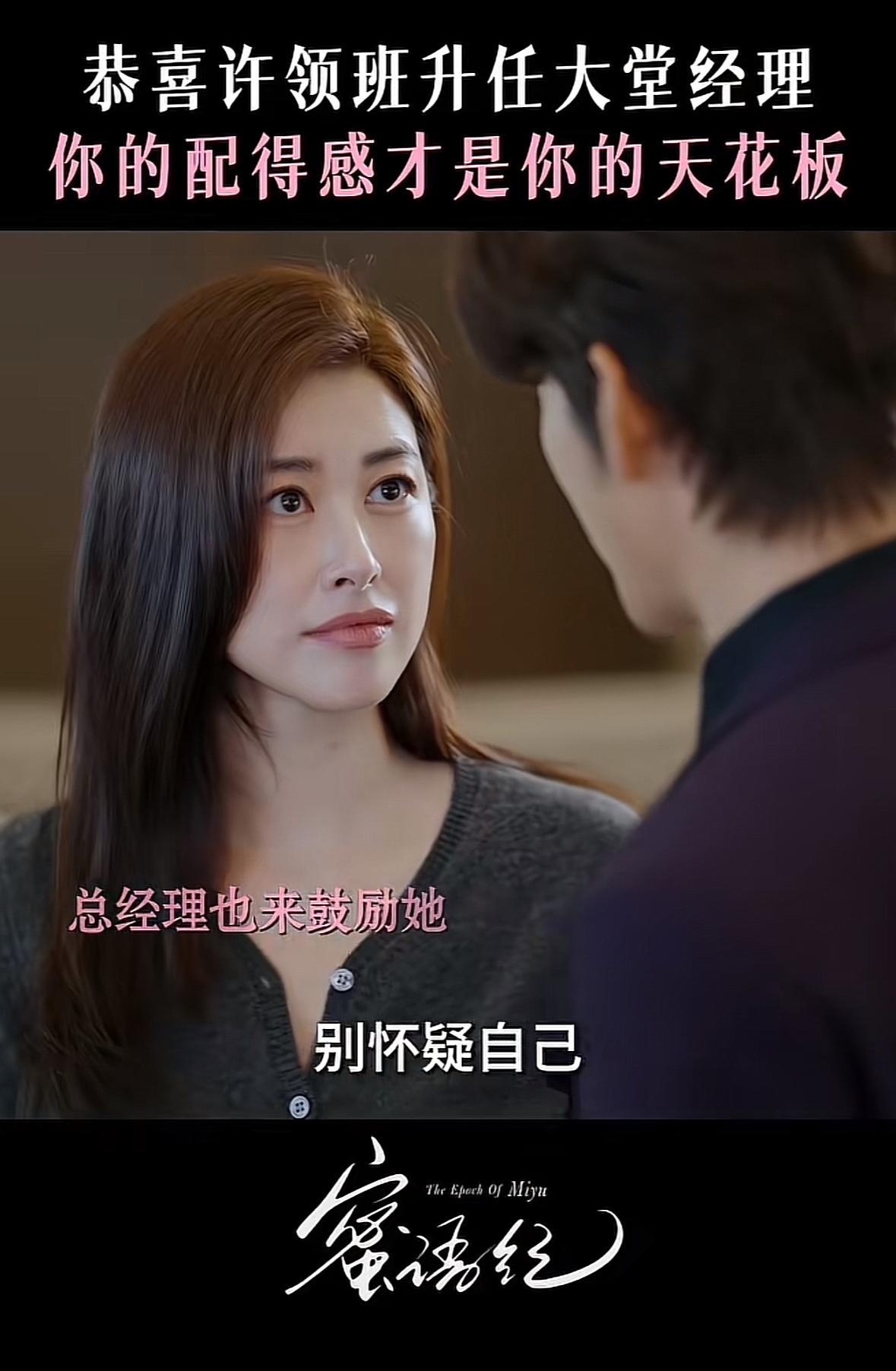 许蜜语终于走马上任大堂经理,不仅魏董事长把她母亲给她的胸针,赠予许蜜语并且鼓励她,纪封也在她上任仪式中站台助威,这也让前厅部张总监也只能勉强鼓掌欢迎,但陆晓妍却全程摆着一张臭脸,之后的工作中也是给许蜜语脸色看,还总以许蜜语不懂前台工作流程为由,屡屡顶撞她,许蜜语到目前一直选择忍让,我相信一定会绝地反击的,这样才能符合许蜜语的人设。