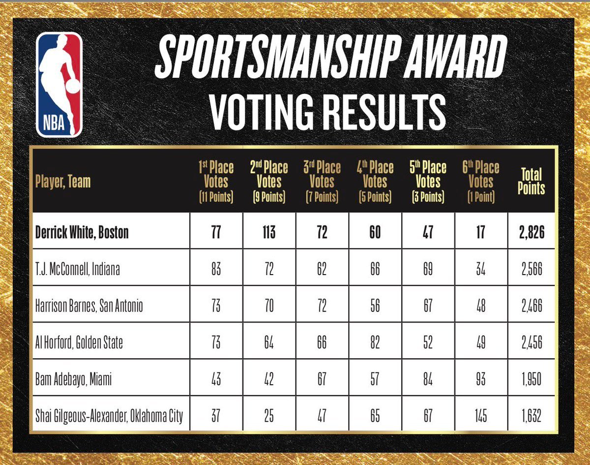 亚历山大在体育道德风尚奖中排名第六,德里克怀特得奖!编辑by小魏雷霆 雷霆2比0
