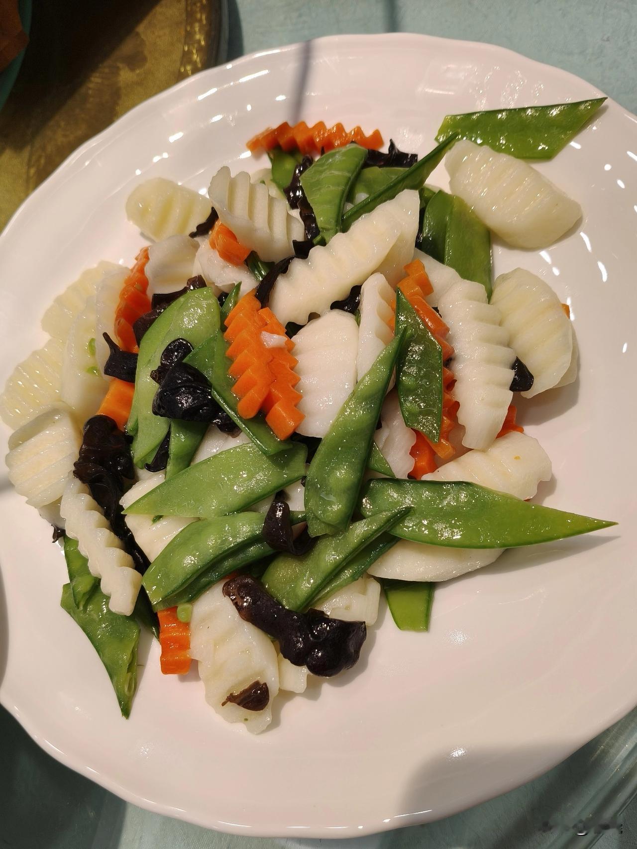 素炒山药胡萝卜荷兰豆,有白色,红色和绿色,被称之为荷塘月色。