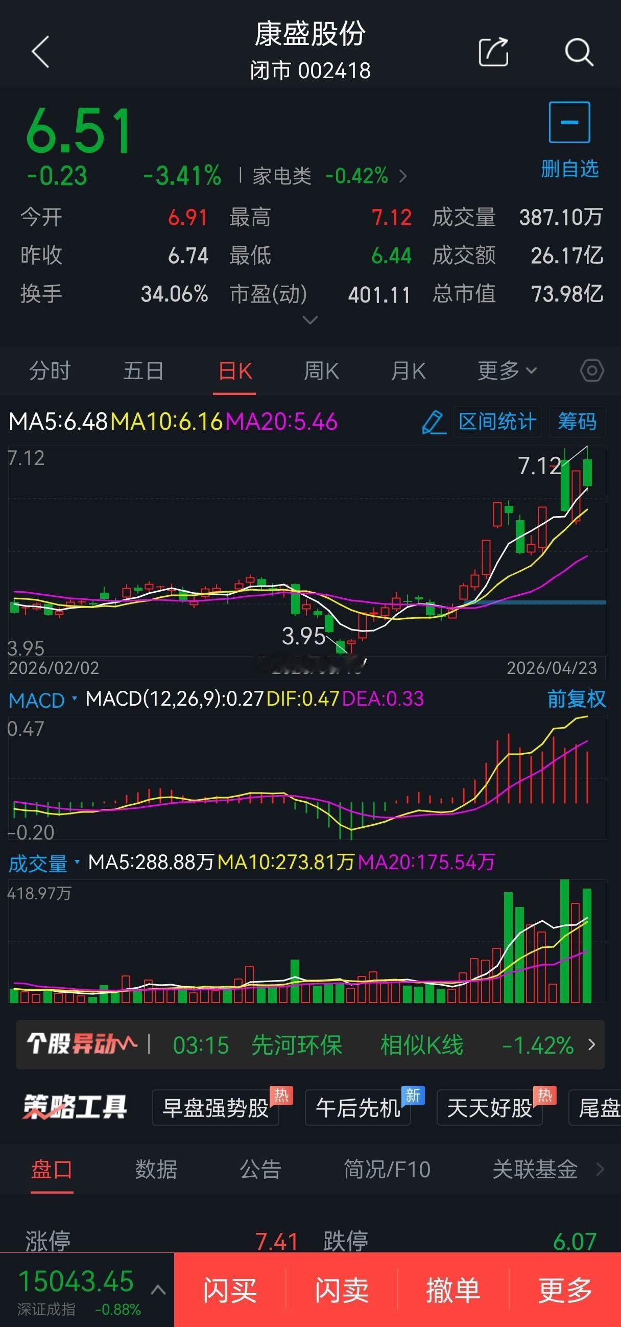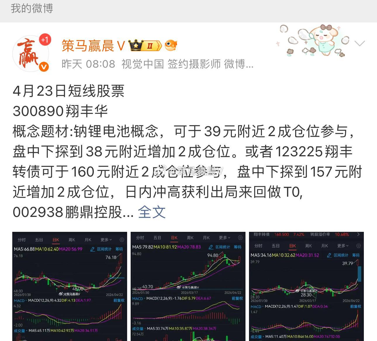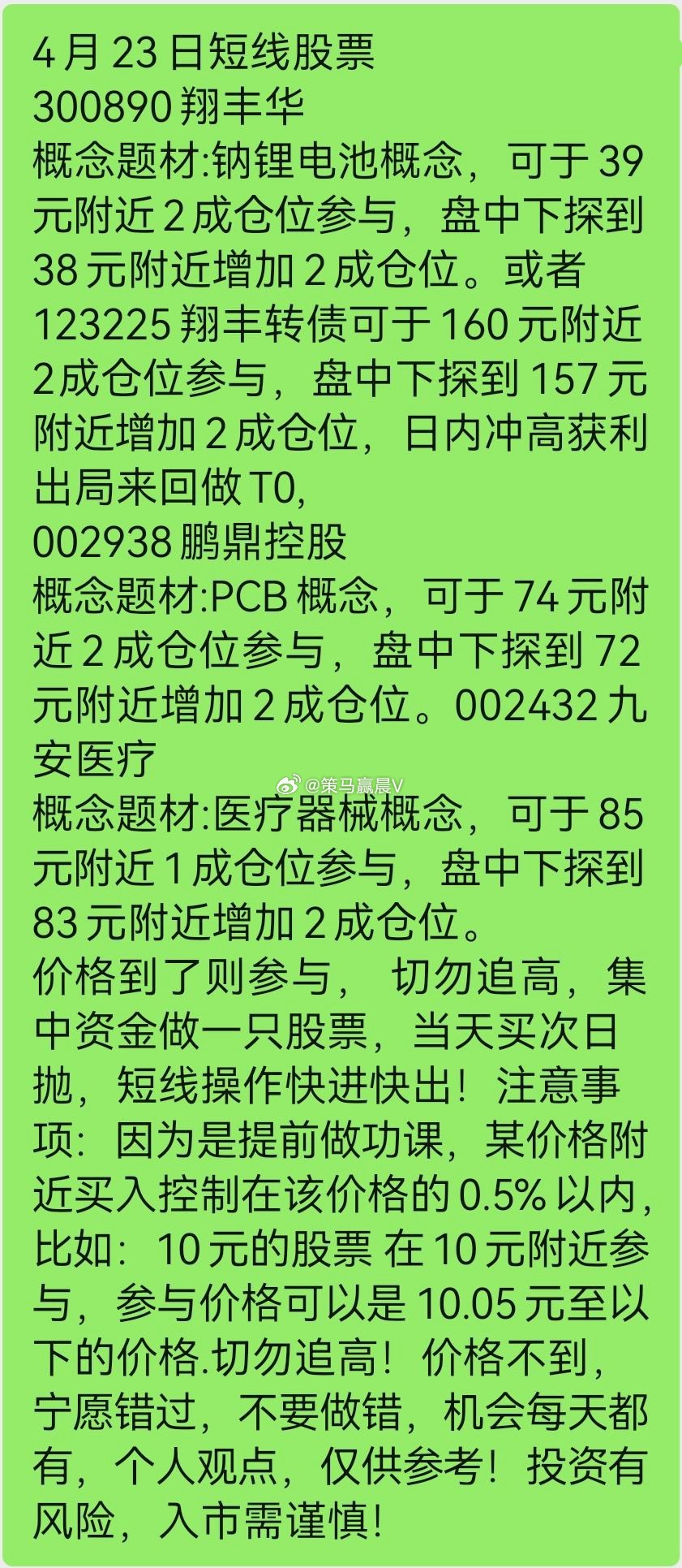 价格到了则参与, 切勿追高,集中资金做一只股票,当天买次日抛,短线操作快进快出!注意事项:因为是提前做功课,某价格附近买入控制在该价格的0.5%以内,比如:10元的股票 在10元附近参与,参与价格可以是10.05元至以下的价格.切勿追高!价格不到,宁愿错过,不要做错,机会每天都有,个人观点,仅供参考!投资有风险,入市需谨慎!$华绿生物(SZ300970)$$鹏鼎控股(SZ002938)$$康盛股份(SZ002418)$