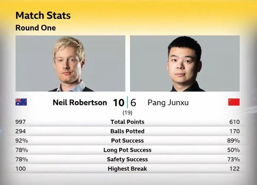 罗伯逊击败庞俊旭晋级,赛后表示,5-5之后自己发挥出色,顺利晋级。还得感谢瓦菲击败斯佳辉,否则第一个前16出局的压力就落在自己头上了。
