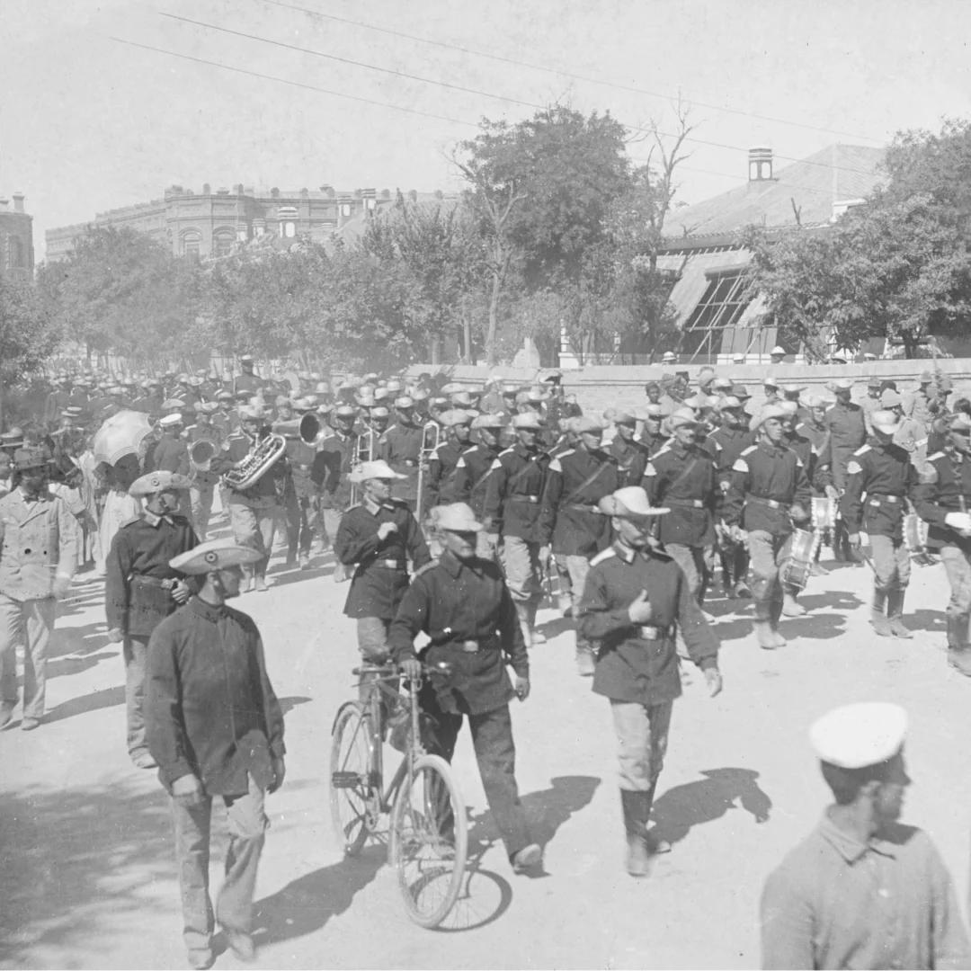 1901年,八国联军在北京城内街头武装行军巡游,整条纵队皆是列强联军武装,近代军服齐整,全套西洋军乐队随行,铜管鼓乐相伴。左侧混杂着清末北京百姓,身着旧式布衣,在街边驻足围观列强军队穿行本国都城