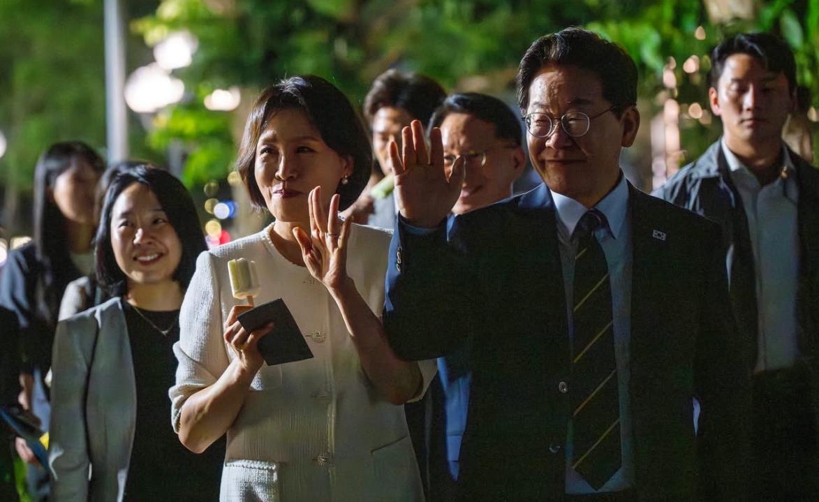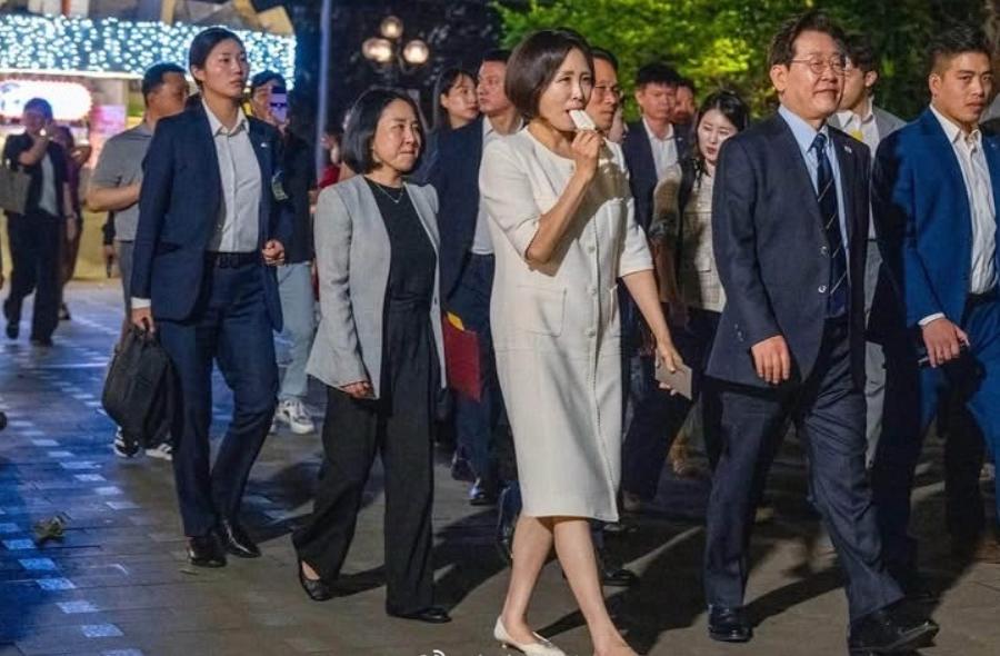 她手里拿了好几个,然后与随行人员分享,夫人边走边吃还被摄影师拍下,画面松弛又随意,而且夫人还拿着没有吃完的雪糕与粉丝合影,也太接地气了吧!