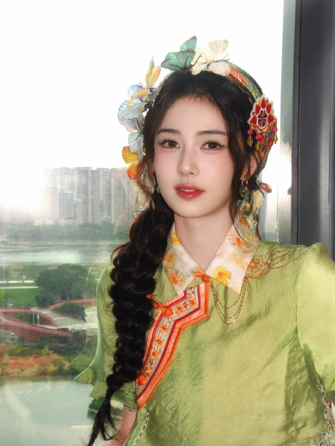 她头戴漂亮的发箍,还绑着超美的大麻花辫,彰显出了浪漫风情,气质极为出众。