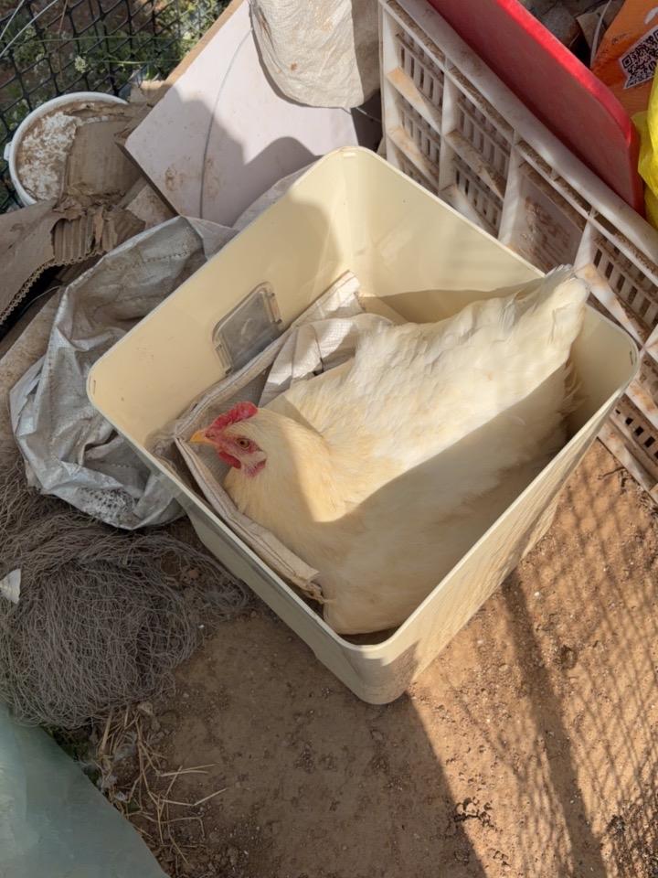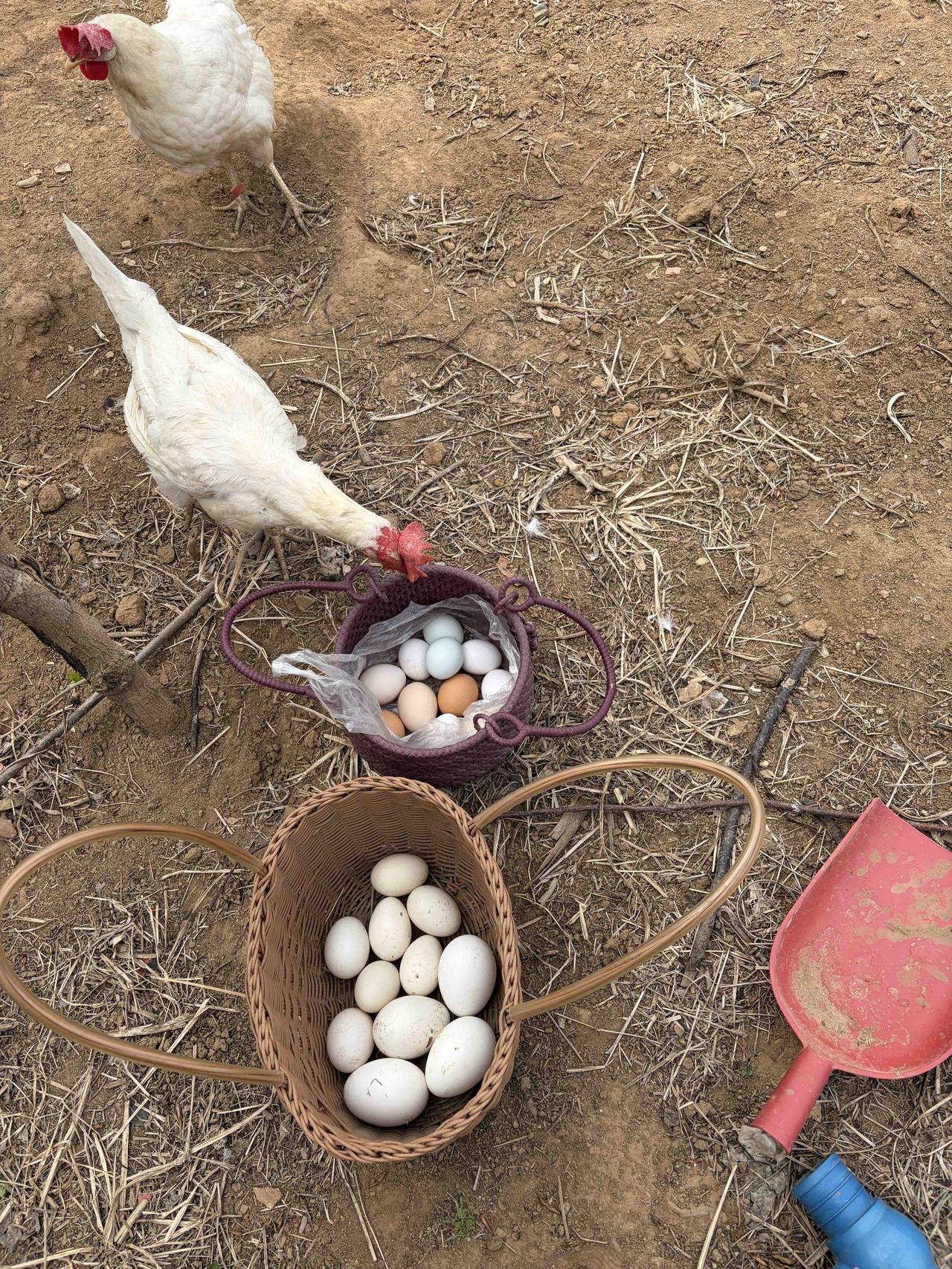 我这只白母鸡,是去年冬天买的那批青年来航鸡里混杂的,小的时候看不出来,可能祖上三代有海南褐基因,到它这一代呈隐形了。而且它不在鸡窝下蛋,在门口盛狗粮空桶里下,可爱得很。