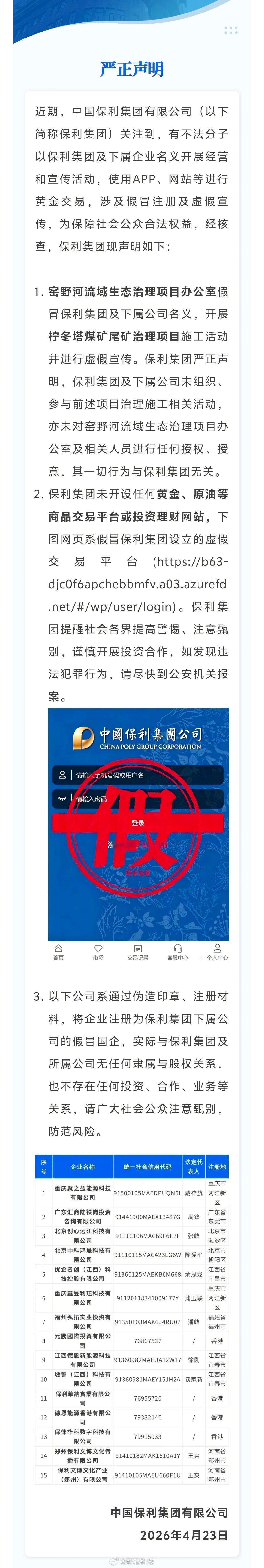 【保利集团发布严正声明】保利集团曾多次打假 4月23日晚间,中国保利官方公众号发布声明称,近期,有不法分子以保利集团及下属企业名义开展经营和宣传活动,使用APP、网站等进行黄金交易,涉及假冒注册及虚假宣传。 保利集团打假