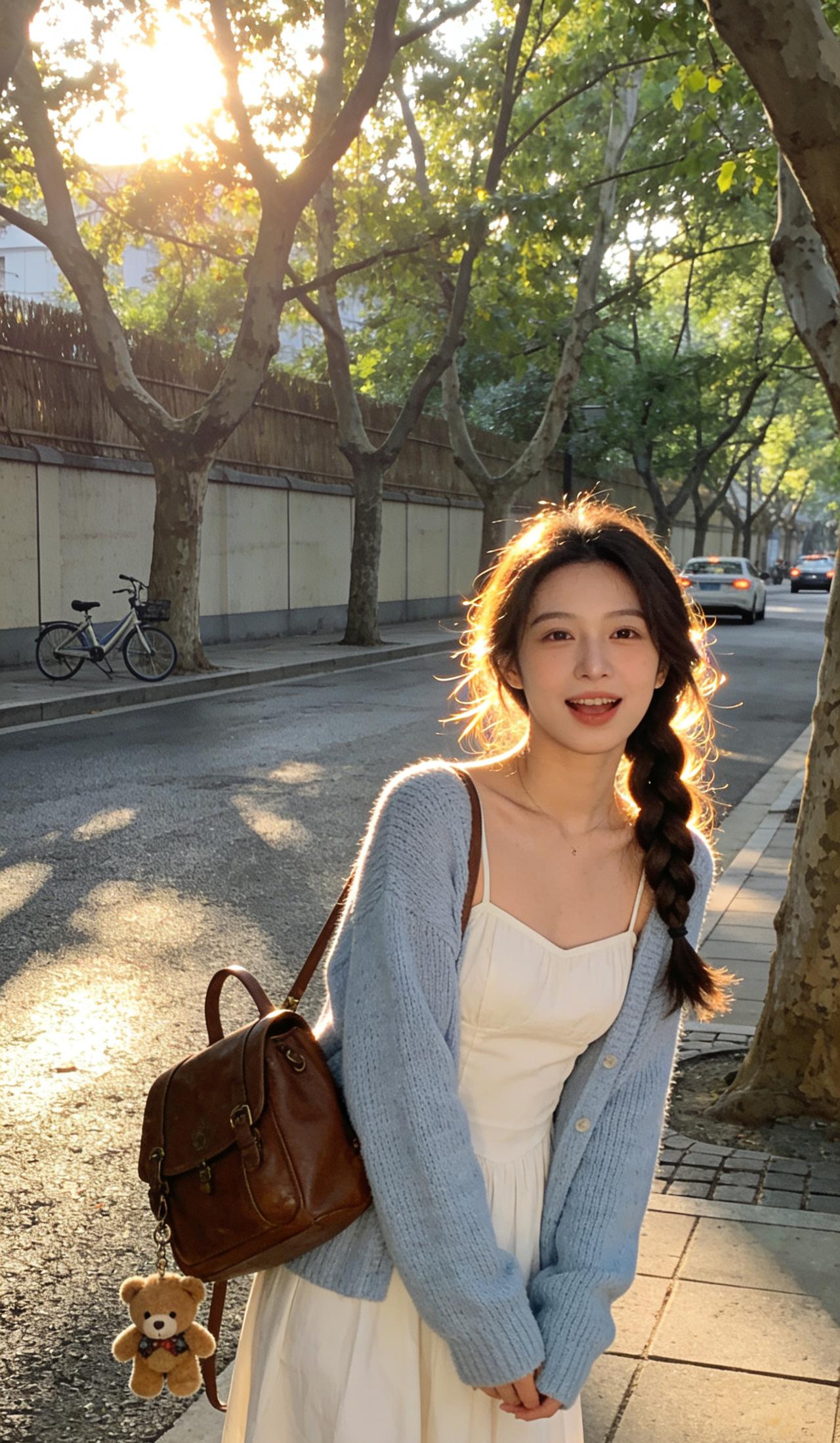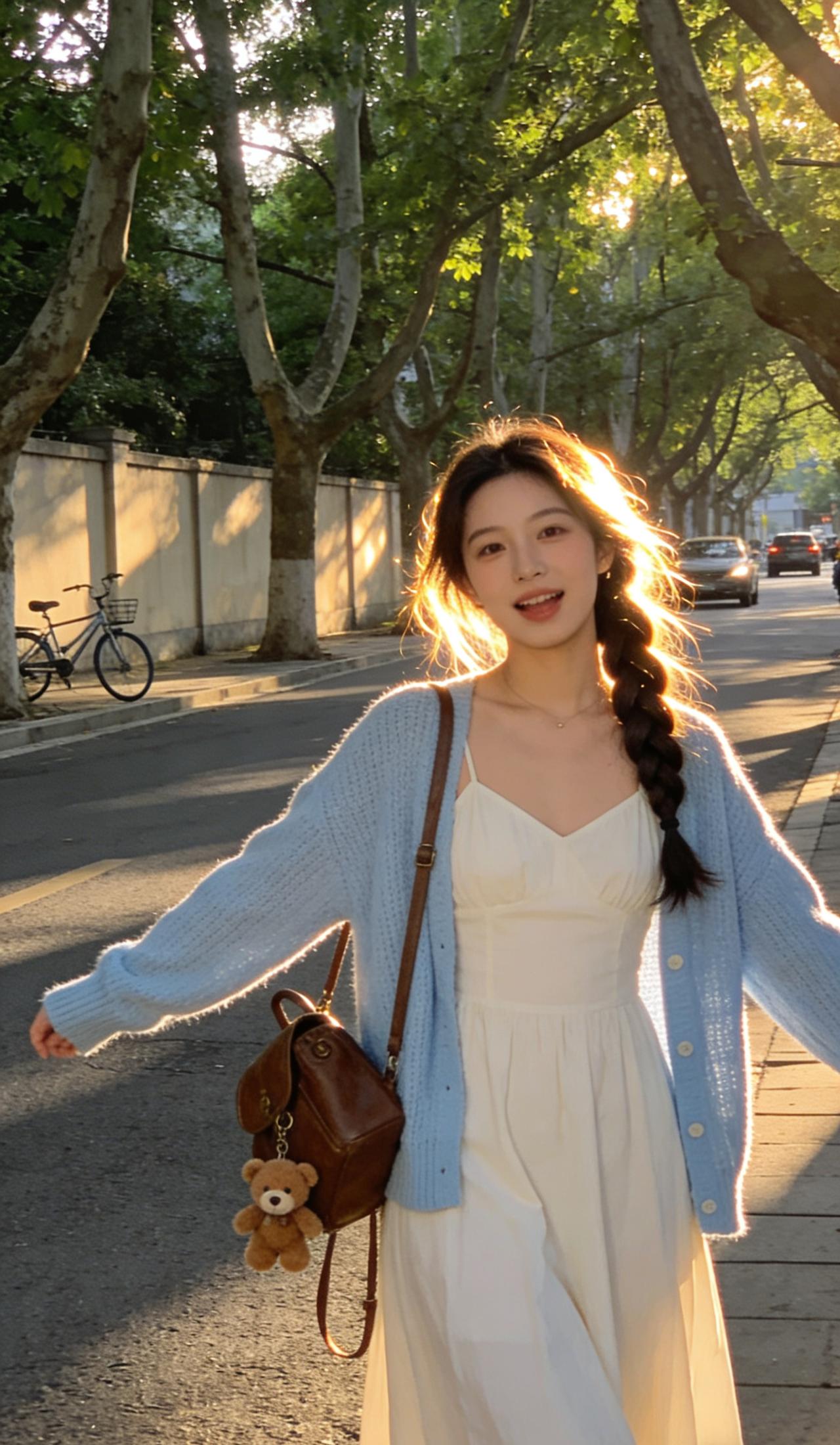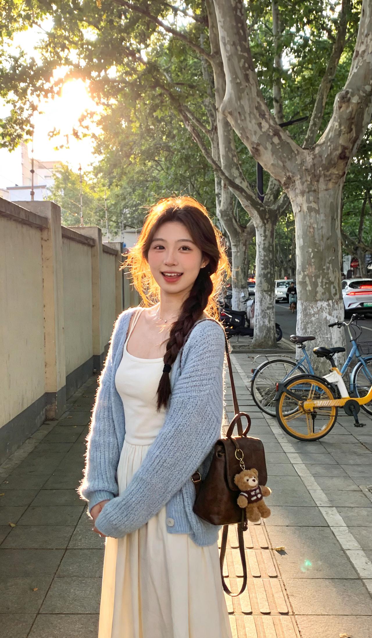 棕色斜挎包与同色系小熊挂件点缀,为造型注入一抹暖调俏皮感;麻花辫发型与温暖光影相呼应,进一步强化了清新柔美的整体调性。画面中自行车、林荫道与斑驳光影交织,宛如日常中偶然定格的温柔瞬间,恰到好处地衬托出少女恬静清新、自然灵动的气质。纯真少女感穿搭 美人照怎么拍才好看 穿搭 有什么舒服好看的女生穿搭 美女人像群