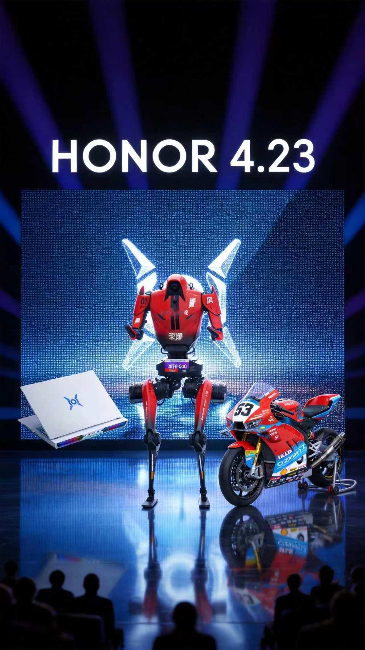 那个半马冠军荣耀机器人闪电和张雪机车也来了荣耀打洲本 的发布会现场 等会一起看荣耀WIN游戏本 发布