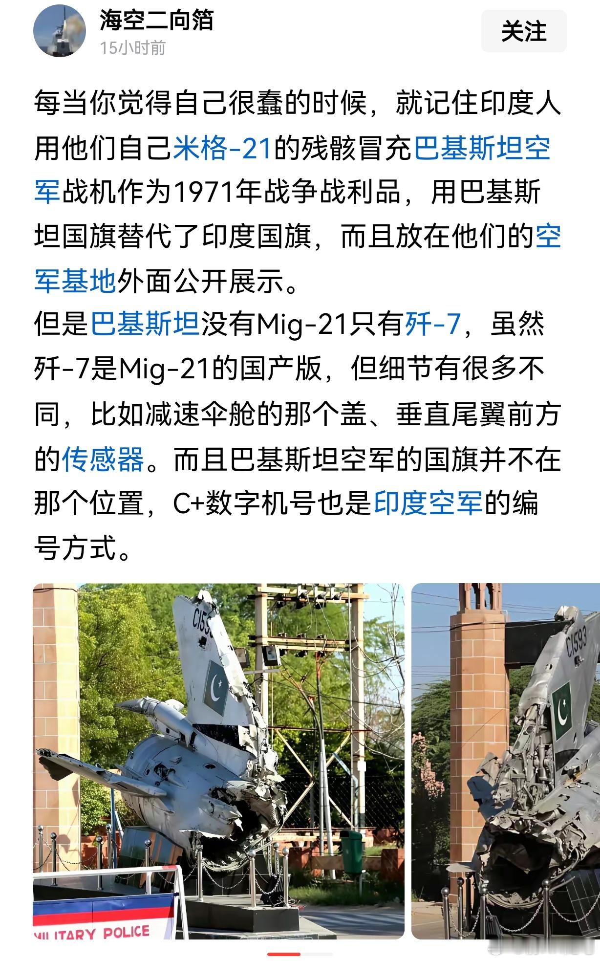 这世界就没有印度阿三做不出来的事:印度人用他们自己米格-21的残骸冒充巴基斯坦空军战机作为1971年战争战利品,用巴基斯坦国旗替代了印度国旗,而且放在他们的空军基地外面公开展示。